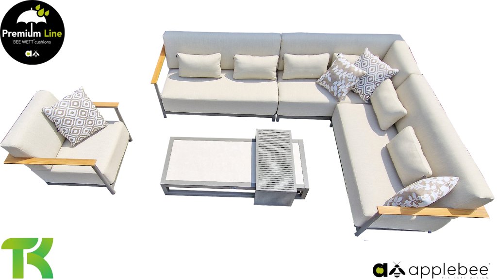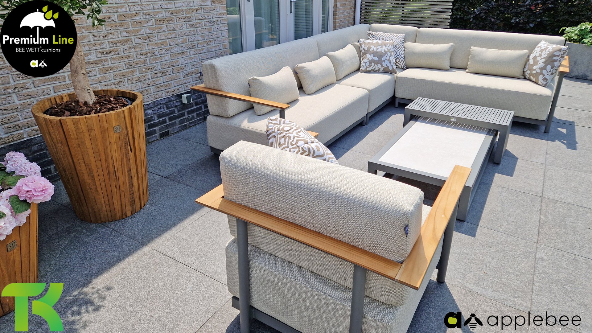With the Apple Bee St. Lucia aluminum lounge, you'll be sitting comfortably, both literally and figuratively... the cushions are a whopping 25 cm thick! The enormously thick cushions give the St. Lucia an instantly luxurious look. The taupe (quartz) aluminum frame has beautiful round legs and a continuous armrest/backrest. As a finishing touch, the top of the armrest is finished with a Natural SVLK teak trim strip, adding that striking detail typical of this Apple Bee design.