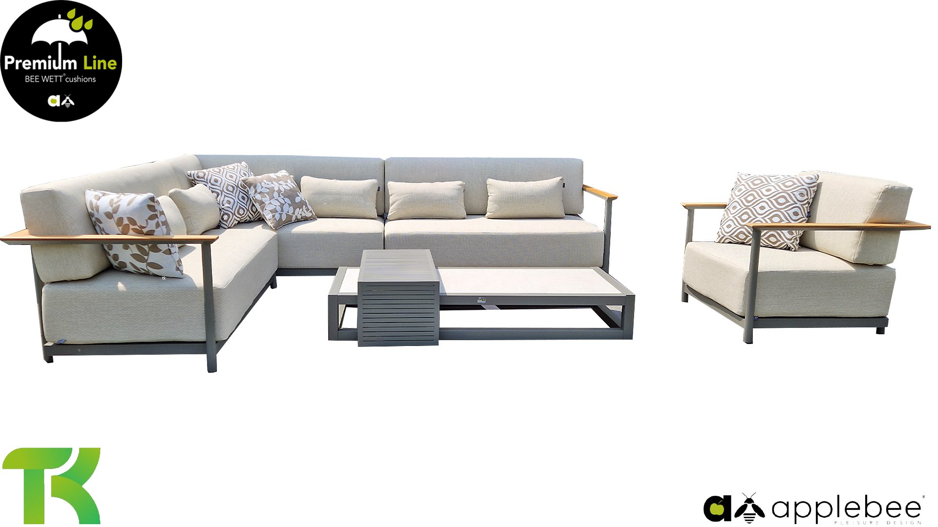 With the Apple Bee St. Lucia aluminum lounge, you'll be sitting comfortably, both literally and figuratively... the cushions are a whopping 25 cm thick! The enormously thick cushions give the St. Lucia an instantly luxurious look. The taupe (quartz) aluminum frame has beautiful round legs and a continuous armrest/backrest. As a finishing touch, the top of the armrest is finished with a Natural SVLK teak trim strip, adding that striking detail typical of this Apple Bee design.