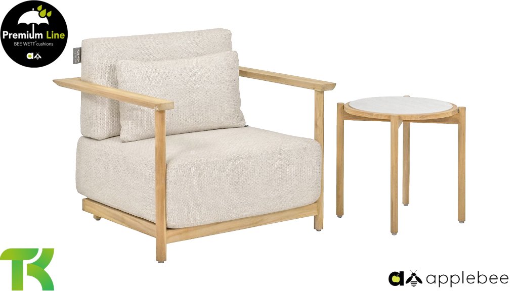 AppleBee St. Lucia Teak Lounge: How luxurious do you want the cushions of your lounge set to be? The St. Lucia Teak Lounge has seat cushions that are no less than 25cm thick, of course in the Apple Bee Bee Wett quality. Despite what you might expect, these cushions also dry considerably faster than cushions with standard foam. Because of the extremely thick cushions, the St. Lucia immediately has a very luxurious appearance, but remains contemporary due to its sleek shape and firmness. This is partly due to the high-quality SVLK teak frame in a natural color. The round legs merge into a tastefully shaped backrest that extends from the arm and embraces you as it were. St. Lucia is robust and refined in the right proportions!