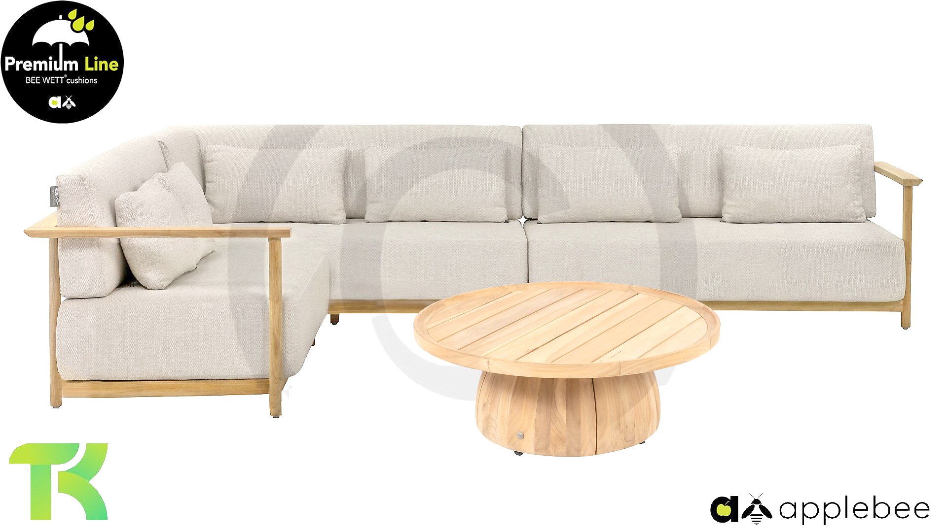 AppleBee St. Lucia Teak Lounge: How luxurious do you want the cushions of your lounge set to be? The St. Lucia Teak Lounge has seat cushions that are as thick as 25cm, of course in Apple Bee Bee Wett quality. Despite what you might expect, these cushions also dry considerably faster than cushions with standard foam. Because of the extremely thick cushions, the St. Lucia immediately has a very luxurious look, but still remains contemporary due to its sleek shape and stability. This is of course also due to the high-quality SVLK teak frame in a natural color. The round legs merge into a tastefully shaped backrest that continues from the armrest over the back and embraces you, as it were. St. Lucia is robust and refined in the right proportions!