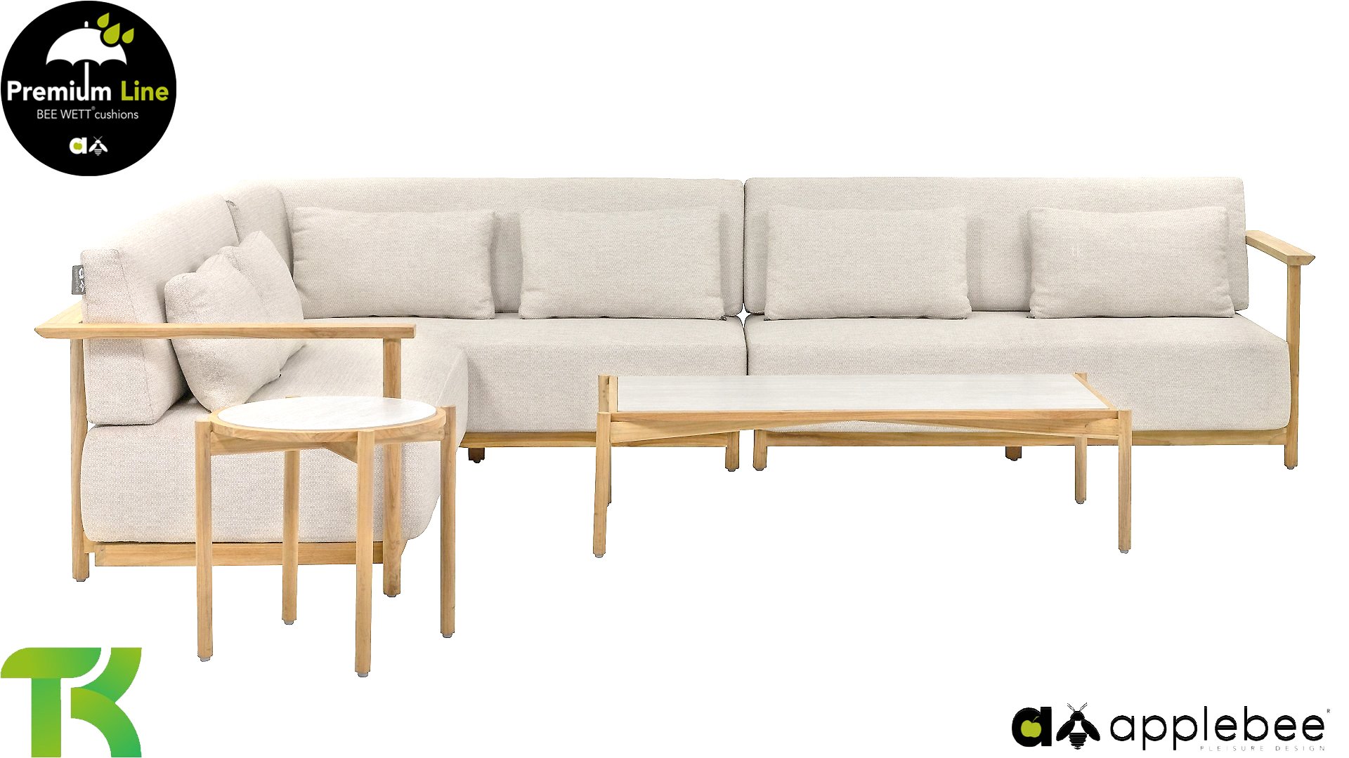 AppleBee St. Lucia Teak Lounge: How luxurious do you want the cushions of your lounge set to be? The St. Lucia Teak Lounge has seat cushions that are a whopping 25cm thick, naturally in Apple Bee Bee Wett quality. Despite what you might expect, these cushions also dry considerably faster than cushions with standard foam. The St. Lucia immediately gets a very luxurious look with the huge thick cushions, but remains contemporary due to its sleek shape and solidity. This is of course also due to the high-quality SVLK teak frame in a natural color. The round legs merge into a tastefully shaped backrest that runs from the arm over the back and embraces you as it were. St. Lucia is robust and refined in the right proportions!