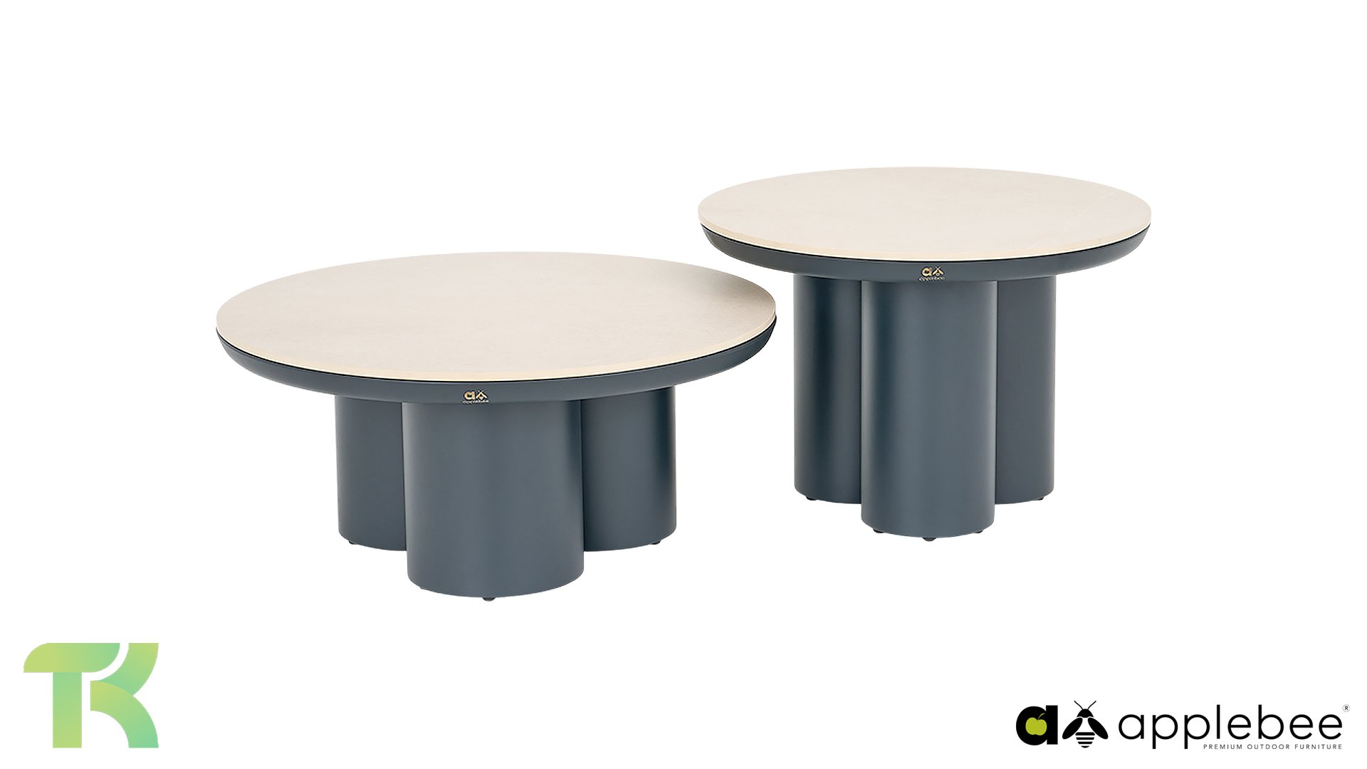 Discover the Apple Bee Tonga coffee table set, the perfect combination of a robust look and modern luxury. This set, consisting of two tables (Ø80x36cm and Ø60x44cm), adds depth and dynamism to any lounge area. The high-quality Sintered Stone tops are not only beautiful but also durable, scratch-resistant, and weather-resistant. The tables rest on a solid powder-coated aluminum base.
