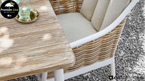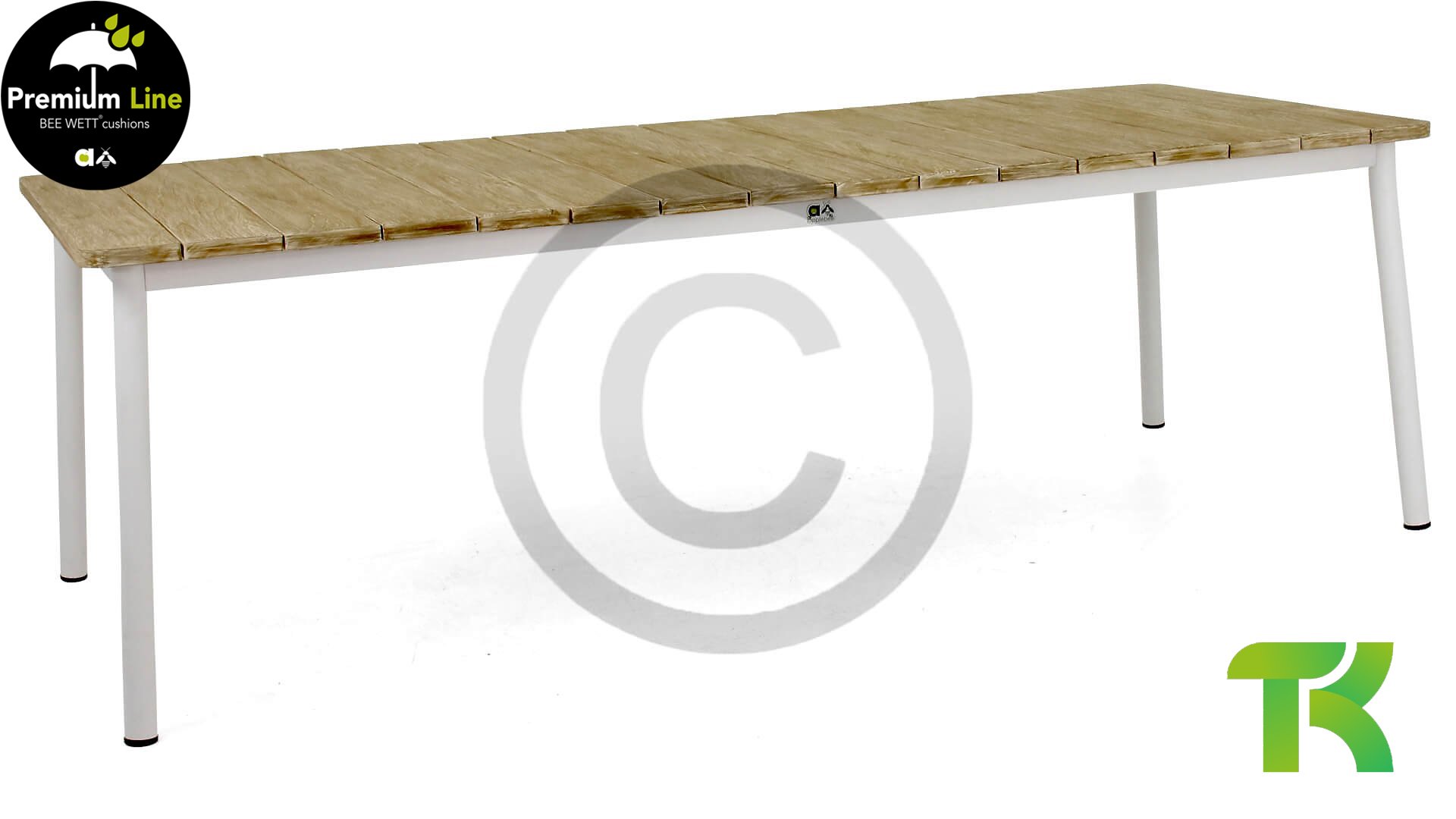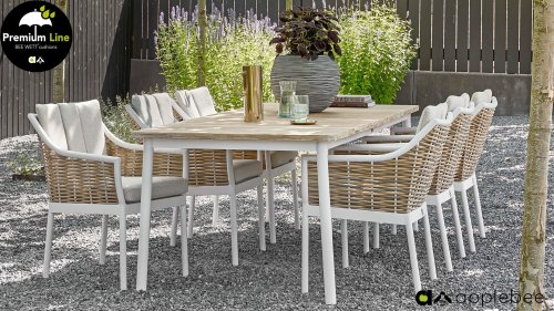 The Applebee Milou table is made from certified teak wood with a powder-coated aluminum frame. The table is therefore very suitable for outdoor living. The dining table from this series is available in 5 versions, including: Applebee Milou table Teak/Alu Black 180cm, Applebee Milou table Teak/Alu Black 240cm, Applebee Milou table LWC/Alu Black 240cm, Applebee Milou table Teak/Alu White 180cm & Applebee Milou table Teak/Alu White 240cm.  There is always an Applebee Milou that fits your terrace! If you prefer a taupe-colored frame, then choose the Bijou table series which is also available in 4 versions.