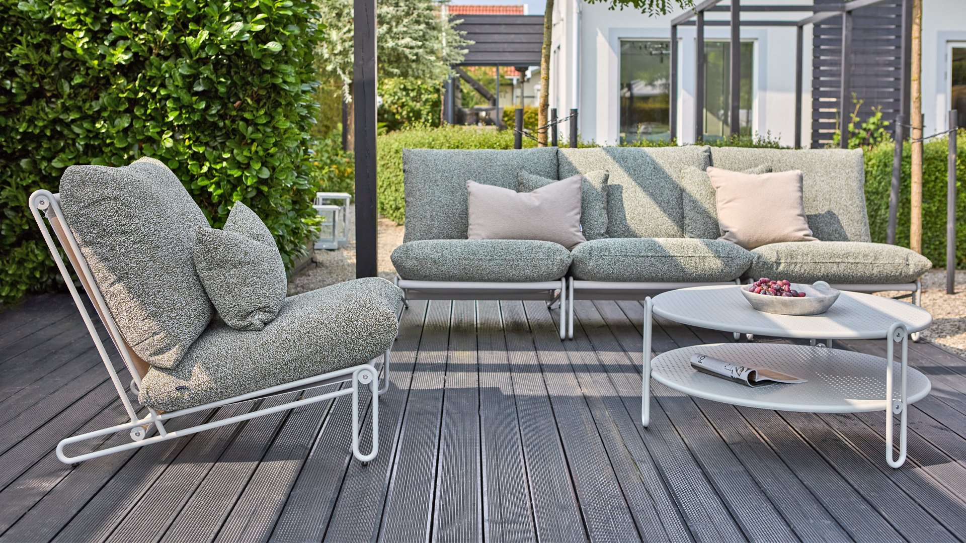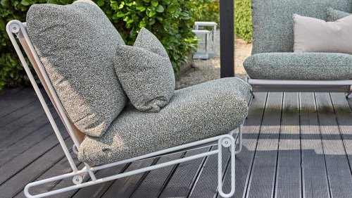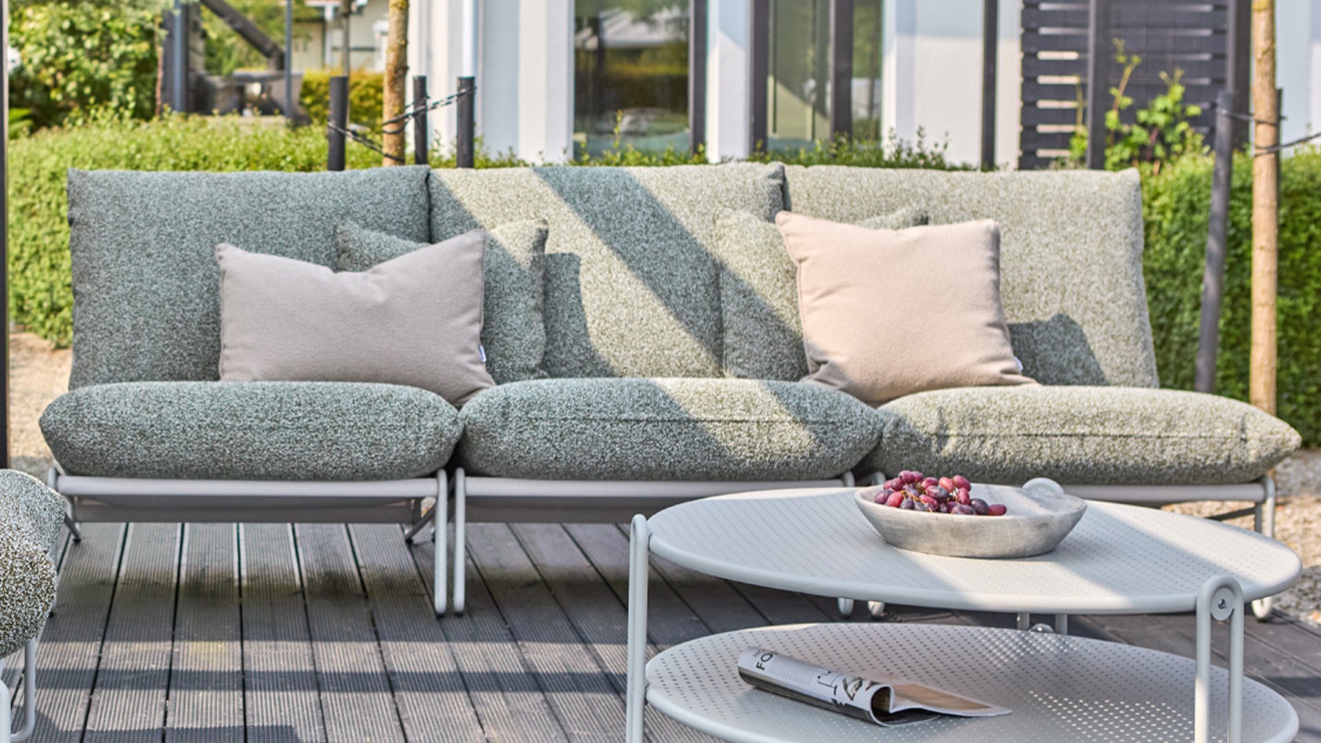 A comfortable lounge sofa that makes a statement. The slanted seat and open aluminum frame create a wonderful place to relax. The cushions come in pink, gray, and beige. The BRAFAB BLIXT sectional sofa for outdoors is part of the BRAFAB range of outdoor furniture and is a modern modular sofa with an aluminum frame and a textile seat. The comfortable cushions are made of water-repellent Olefin fabric. Each seat can be used as a standalone armchair or connected together to create an outdoor sofa as long as you want!
