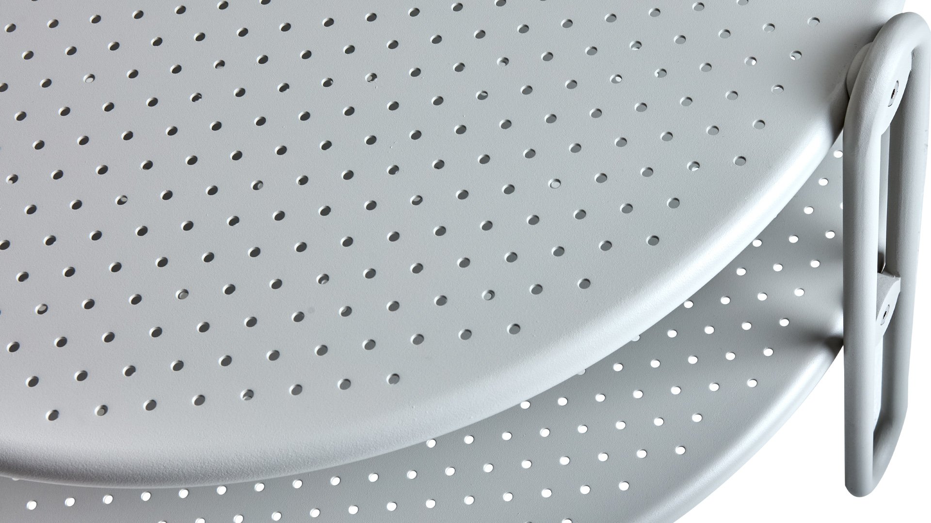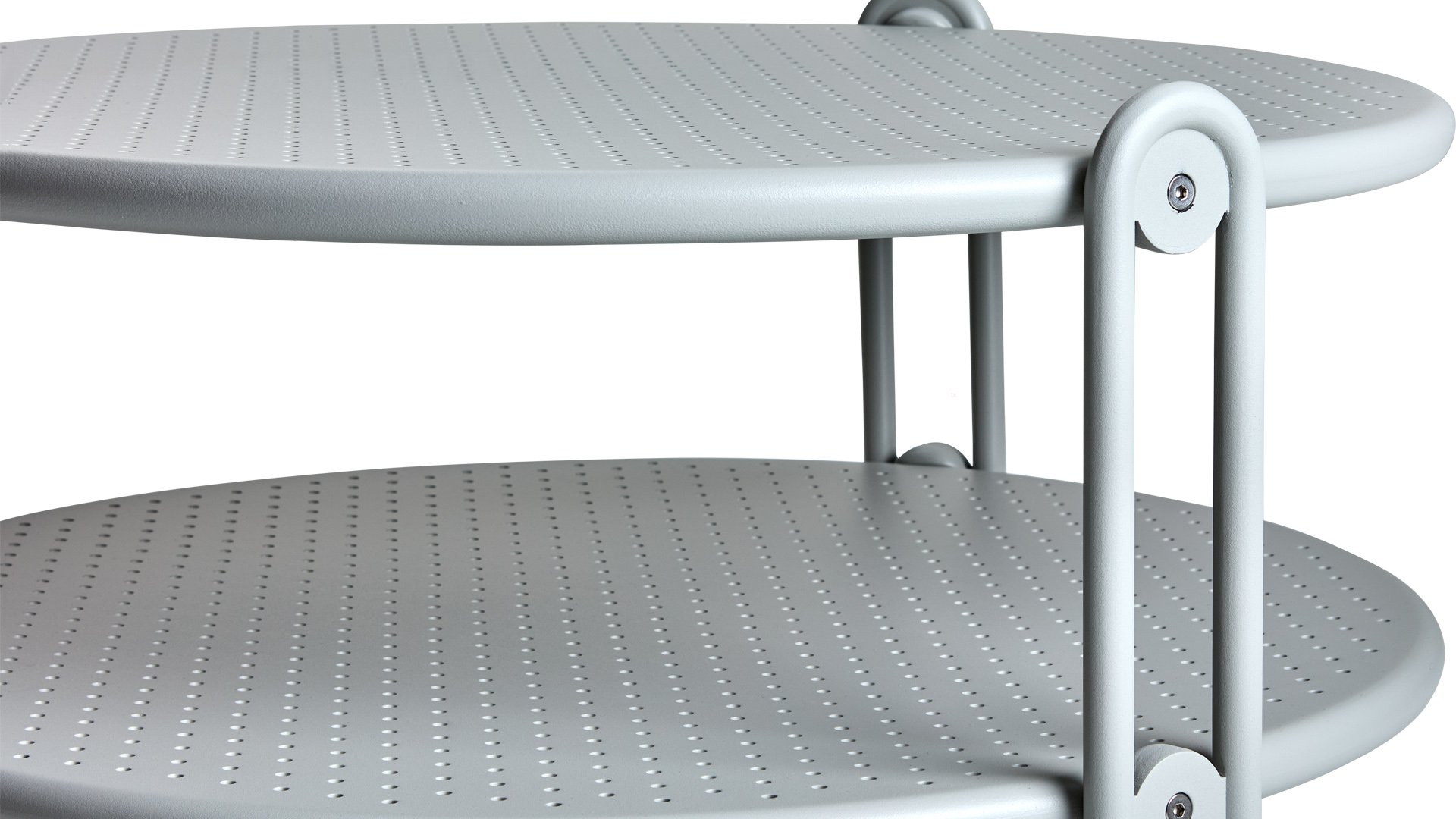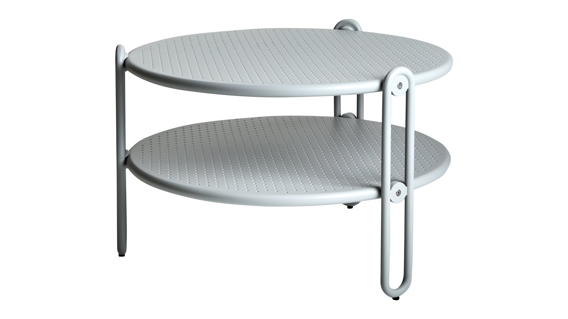 The round Blixt coffee table is available in two heights and sizes: a higher (42 cm) with a diameter of 65 cm and a lower (39 cm) with a diameter of 85 cm. The two round metal tops at different levels are perforated – a nice and also practical detail. Available in matte black and white. Place them alone or together - they can partially overlap thanks to the small height difference.