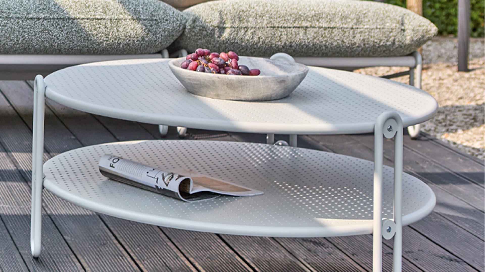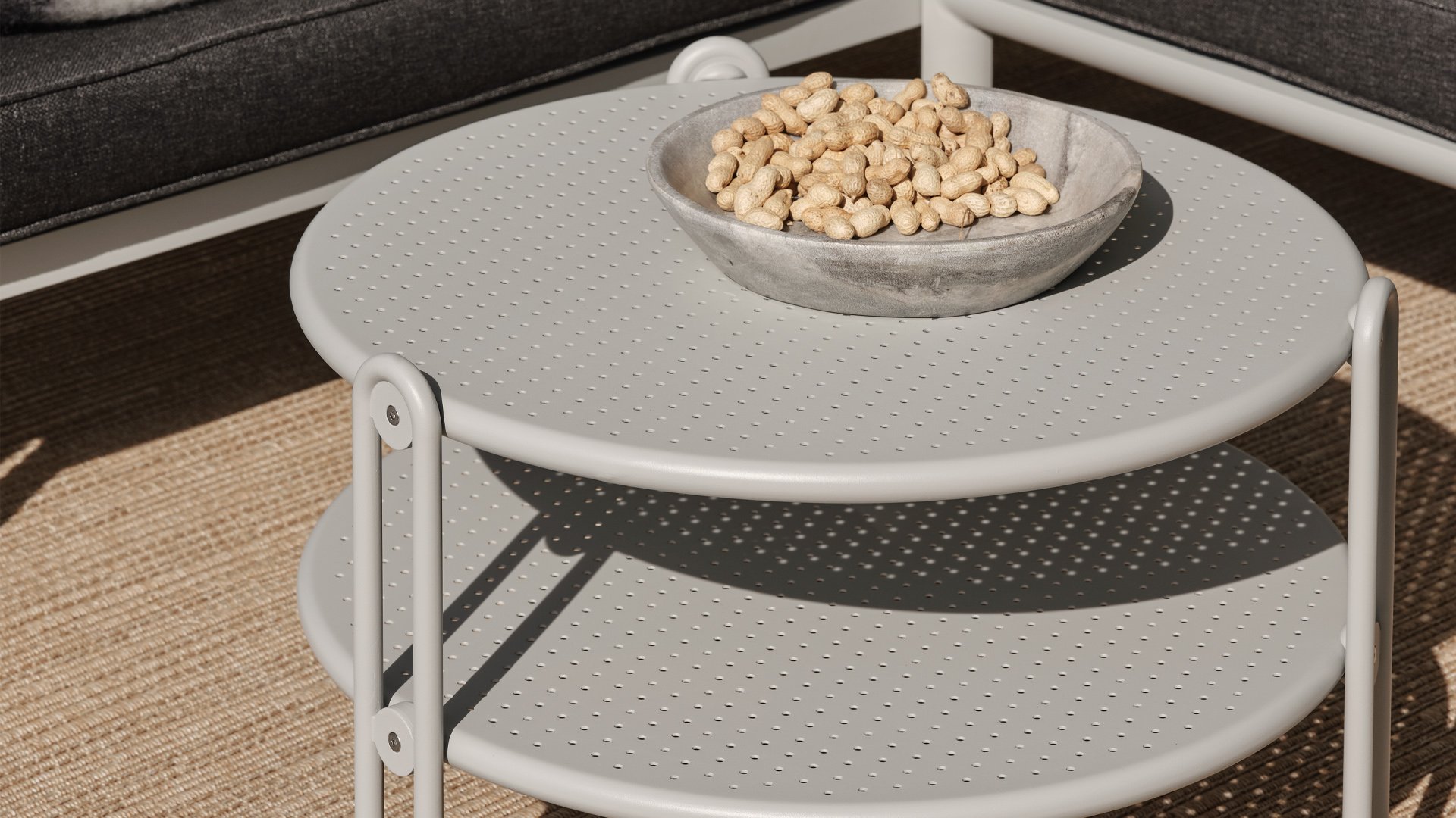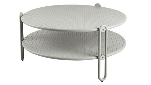 The round Blixt coffee table is available in two heights and sizes: a higher one (42 cm) with a diameter of 65 cm and a lower one (39 cm) with a diameter of 85 cm. The two round metal tops at different levels are perforated – a beautiful and also practical detail. Available in matte black and white. Place them alone or together - they can partially overlap each other thanks to the small height difference.