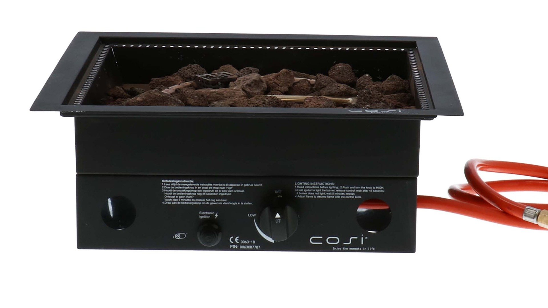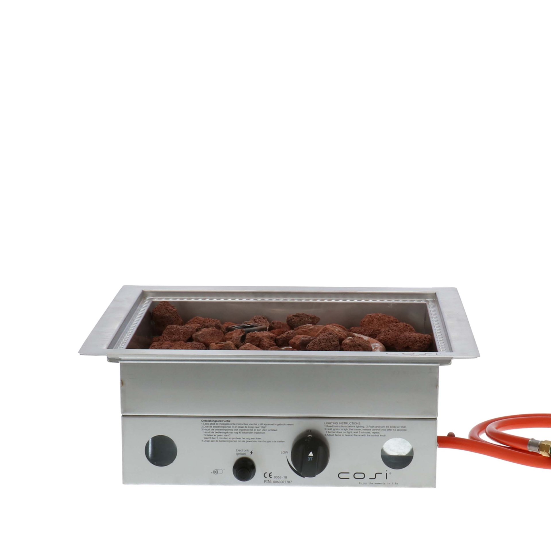The Cosi Burners are very easy to use, the control panel is located at the bottom of the built-in burners. Each Cosi fires is equipped with an electronic ignition which works on a battery. Press the control knob and the Cosi built-in burner will start to ignite, in addition, turn the knob to the right to open the gas supply, the Cosi will ignite itself automatically. Hold the control knob for 10 seconds and the fire will continue to burn, time to enjoy!