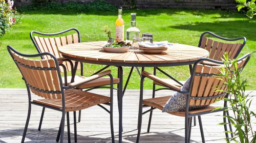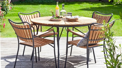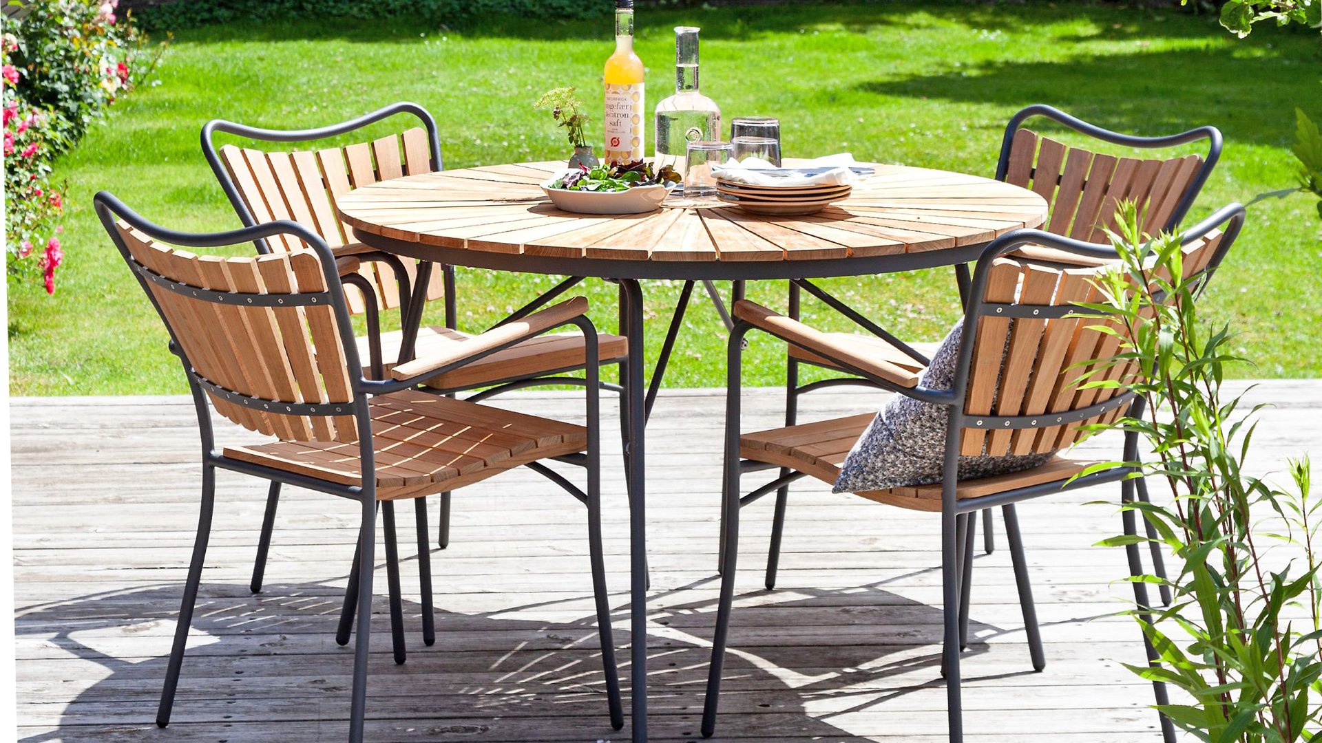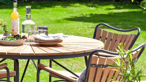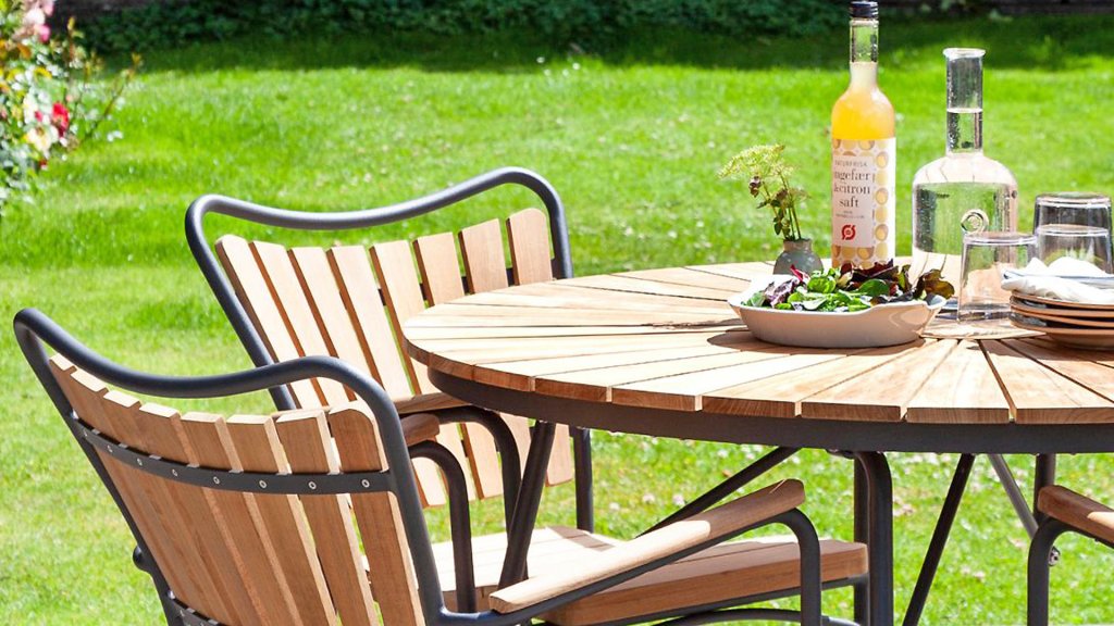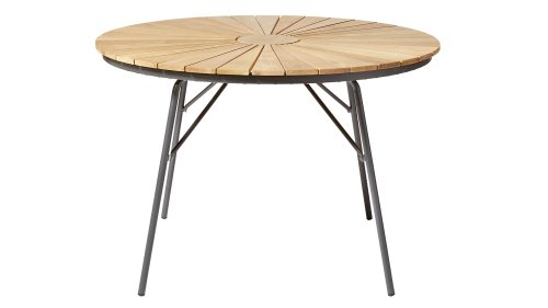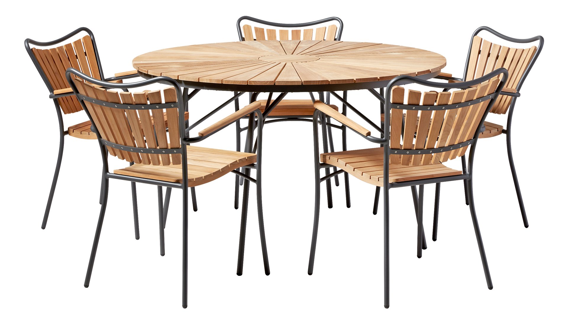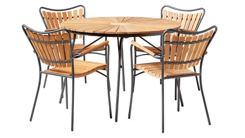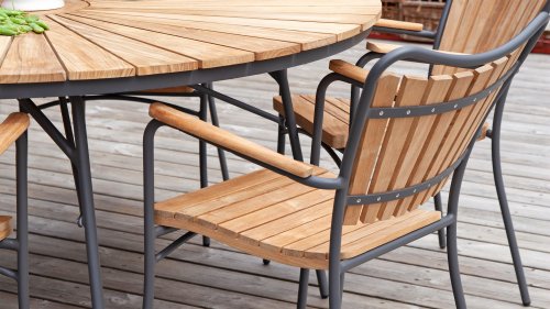 Both the Ellen tables and Ellen chairs from CINAS are available in Anthracite or White powder-coated aluminum frames. The warm Teak wood combined with the anthracite or white frames is a beautiful combination.