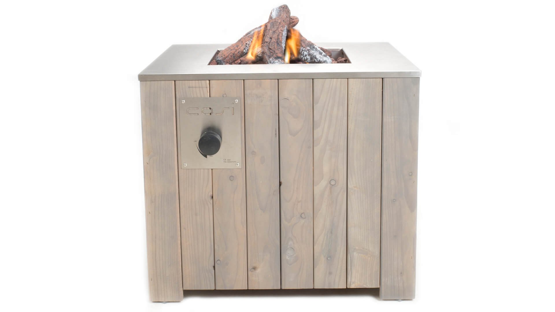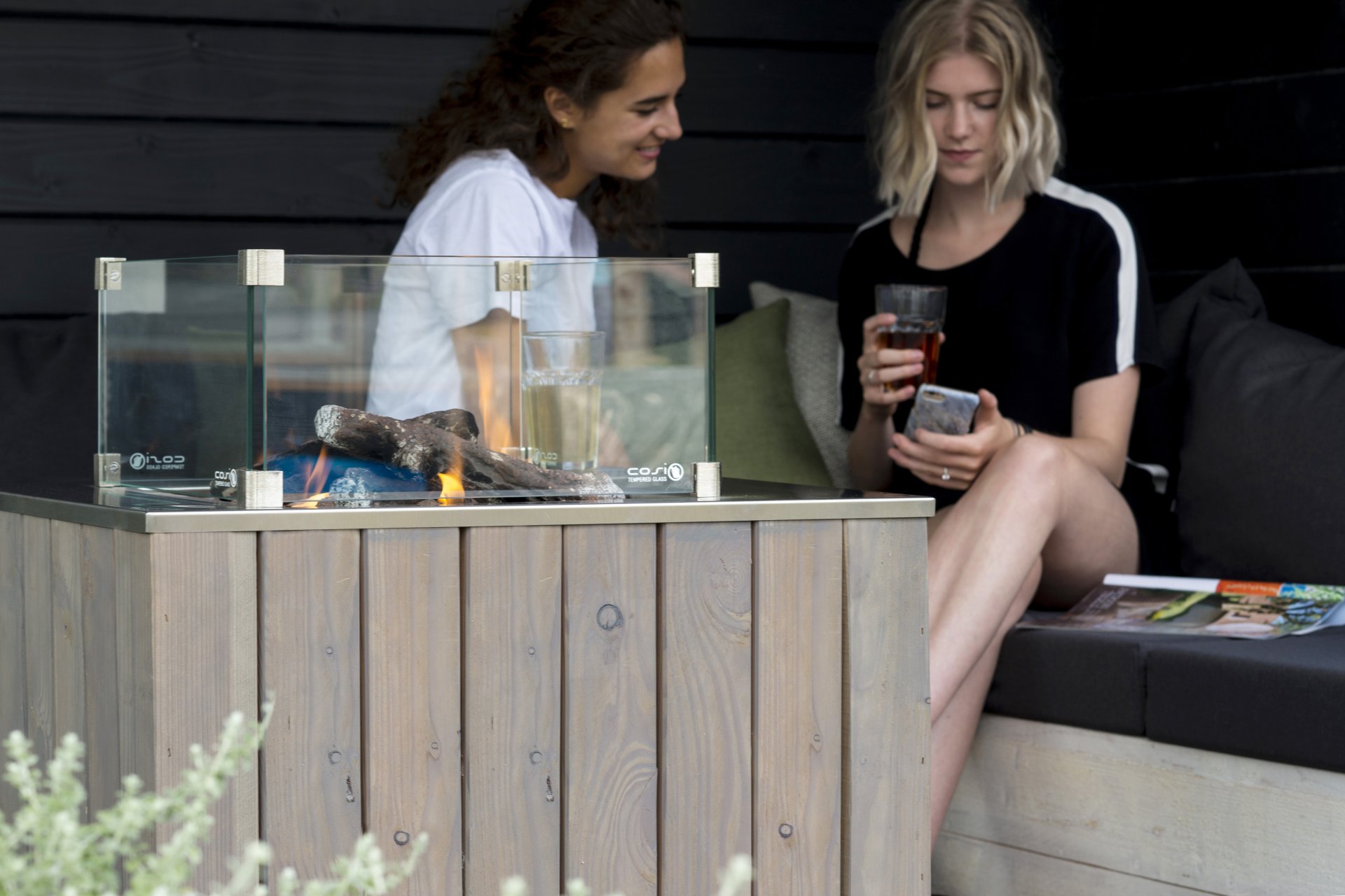 The best-selling product from Cosi Fires! The robust Cosi Cube 70 is made of Douglas wood combined with a stainless steel outdoor-quality top plate. The Cosi Cube 70 is available in Grey Wash and Black finishes. The Cosi Cube 70 is the compact variant in this series with its dimensions. A square glass set is available separately for the Cosi Cube. With the separately available tabletop, it can also be turned into a lounge table. The 5 kg gas bottle can be easily placed in the model through the nicely concealed side hatch.