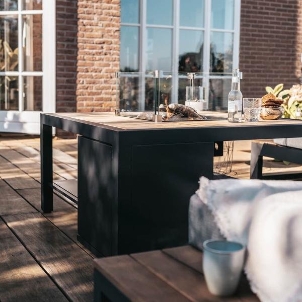 The Cosiflow series excels in its simplicity. The Cosiflow is entirely made of aluminum, so you don't have to worry about maintenance with this table. In addition, this table matches any garden set with its sleek design. Whether you choose teak, upholstered, or plastic, the Cosiflow always matches. Underneath the Cosiflow table, there is an extra tabletop to place loose items. The Cosiflow fire table is delivered ready for use. This means that a pressure regulator with gas hose, battery for ignition, ceramic logs, and lava stones are already included.
