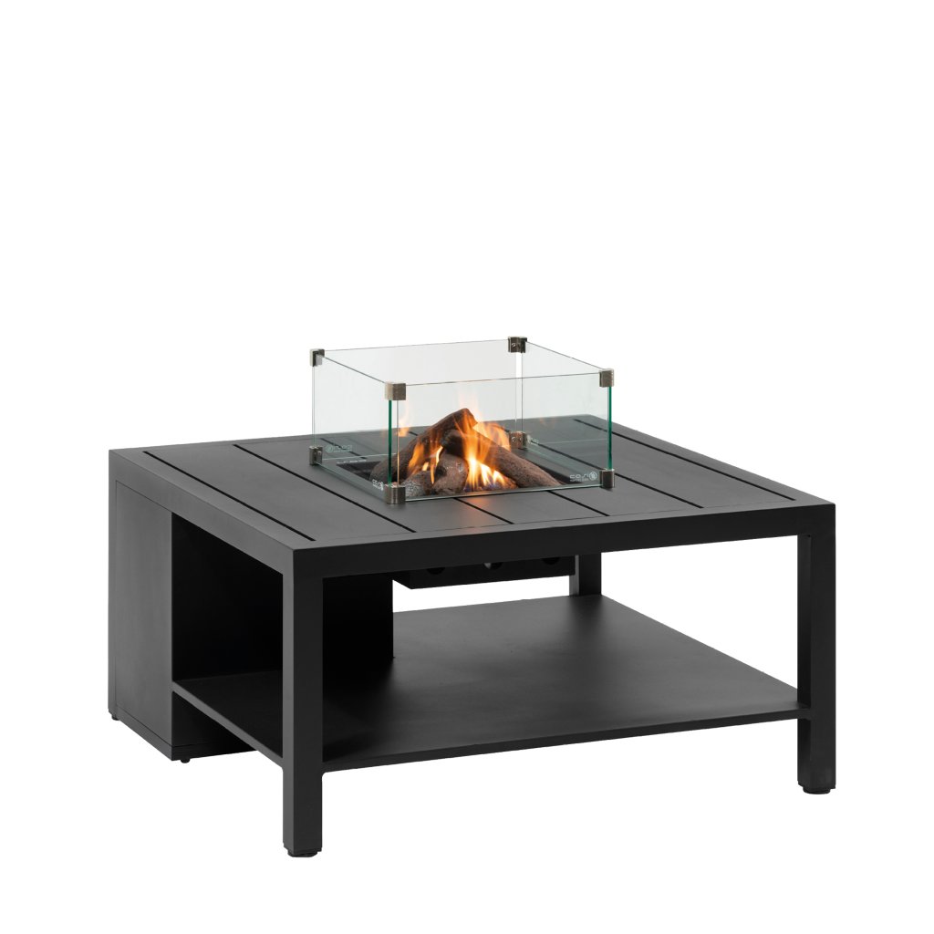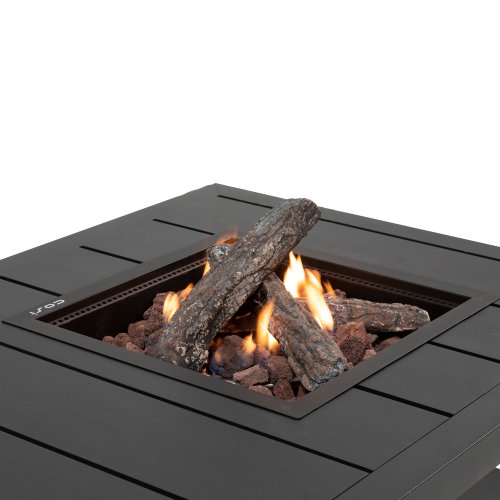 The Cosiflow series excels in its simplicity. The Cosiflow is made entirely of aluminum, so no maintenance is required for this table. In addition, this table's sleek design matches any garden set, whether it is made of teak, upholstered, or plastic. Underneath the Cosiflow table, there is an extra shelf to place loose items. The Cosiflow fire table comes ready for use, which means that a pressure regulator with a gas hose, ignition battery, ceramic logs, and lava stones are included.