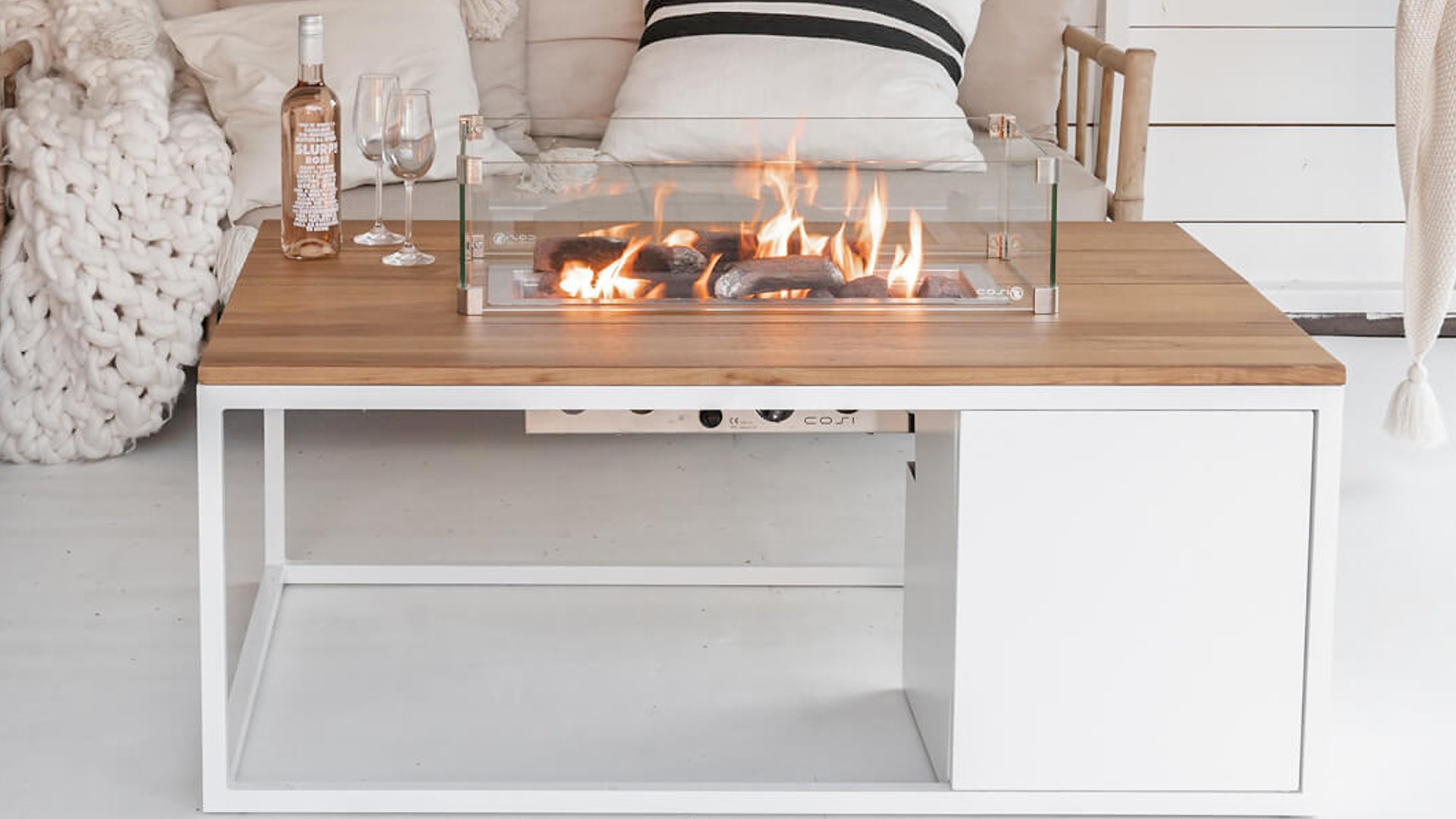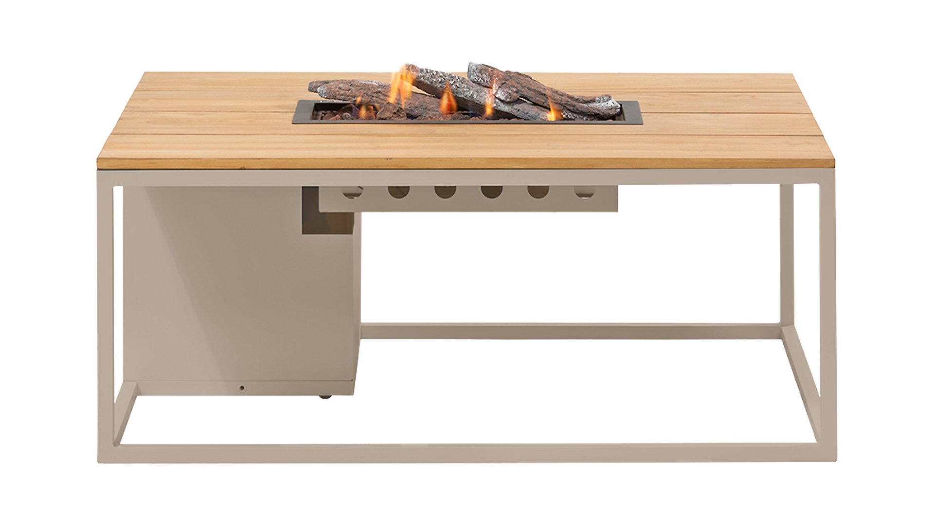 The Cosiloft 120 lounge table can easily be combined with a wide range of lounge sets. The Cosiloft 120 lounge table features a straight burner that provides enough space to invite all your friends and family for a drink. The Cosiloft is 80 cm wide and 120 cm long. This fire table, like the Cosiloft 100, has a beautiful, openworked aluminum frame that can be combined with one of three tabletops: teak, black, and gray. The frame is available in two colors: white for a modern look or black for an industrial style. Despite its beautiful lounge table height, the Cosiloft 120 can even accommodate a 5 kg gas bottle, which is well integrated into the pure design of the Cosiloft table. Each Cosiloft comes with a cover plate for the burner. When the fireplace is not on, you can still use the entire table surface in this way.