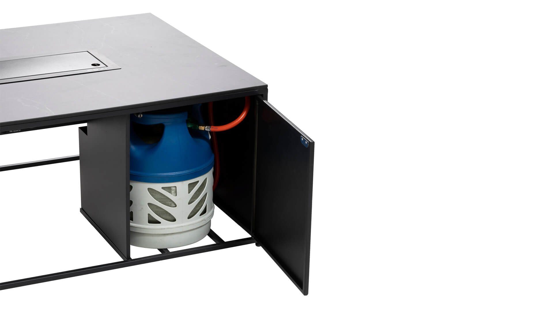 The Cosiloft 120 lounge table can be easily combined with a wide range of lounge sets. The Cosiloft 120 lounge table features a straight burner that provides enough space to invite all your friends and family for drinks. The Cosiloft is 80 cm wide and 120 cm long. Like the Cosiloft 100, this fire table has a beautifully designed open aluminum frame that can be combined with one of three table tops: teak, black, and gray. The frame is available in two colors: white for a modern look or black for an industrial style. Despite its beautiful lounge table height, the Cosiloft 120 can even fit a 5 kg gas bottle. This is well integrated into the pure design of the Cosiloft table. Each Cosiloft comes with a cover plate for the burner. If you don’t have the fire on, you can still use the entire table surface.