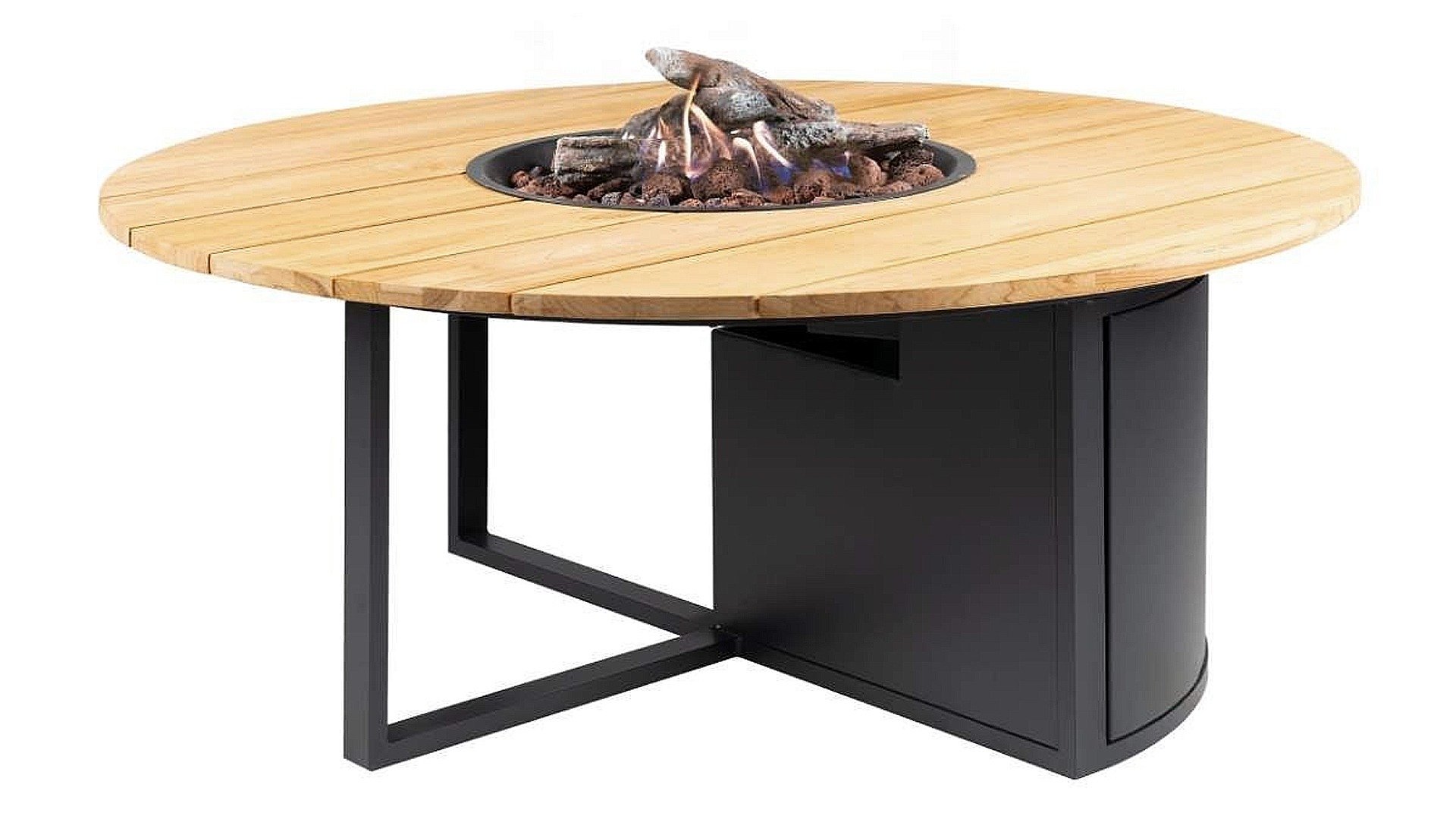 Looking for a round fire table to gather around with friends and family? Then the Cosiloft 120 round is the fire table for you! The Cosiloft 120 round is a new addition to the Cosiloft fire table series. The Cosiloft features a beautiful, open-worked aluminum frame with a teak tabletop. The frame is available in two colors: white for a modern look or black for an industrial style. Despite its attractive lounge-table height, the Cosiloft 120 round even fits a 5 kg gas bottle. This is beautifully integrated into the clean design of the Cosiloft table.