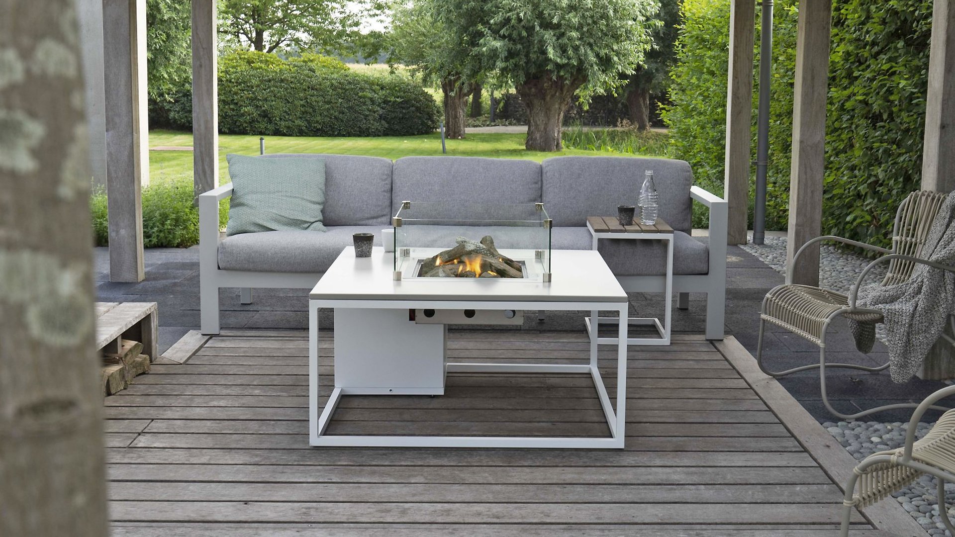 The Cosiloft 120 lounge table can easily be combined with a wide range of lounge sets. The Cosiloft 120 lounge table features a straight burner that provides enough space to invite all your friends and family for a drink. The Cosiloft is 80 cm wide and 120 cm long. Like the Cosiloft 100, this fire table has a beautiful, openwork aluminum frame that can be combined with one of three table tops: teak, black, and grey. The frame is available in two colors: white for a modern look or black for an industrial style. Despite its beautiful lounge table height, the Cosiloft 120 can even accommodate a 5 kg gas cylinder. This is well integrated into the pure design of the Cosiloft table. An cover plate for the burner is included with each Cosiloft. So even if you don't have the fireplace on, you can still use the total table surface.