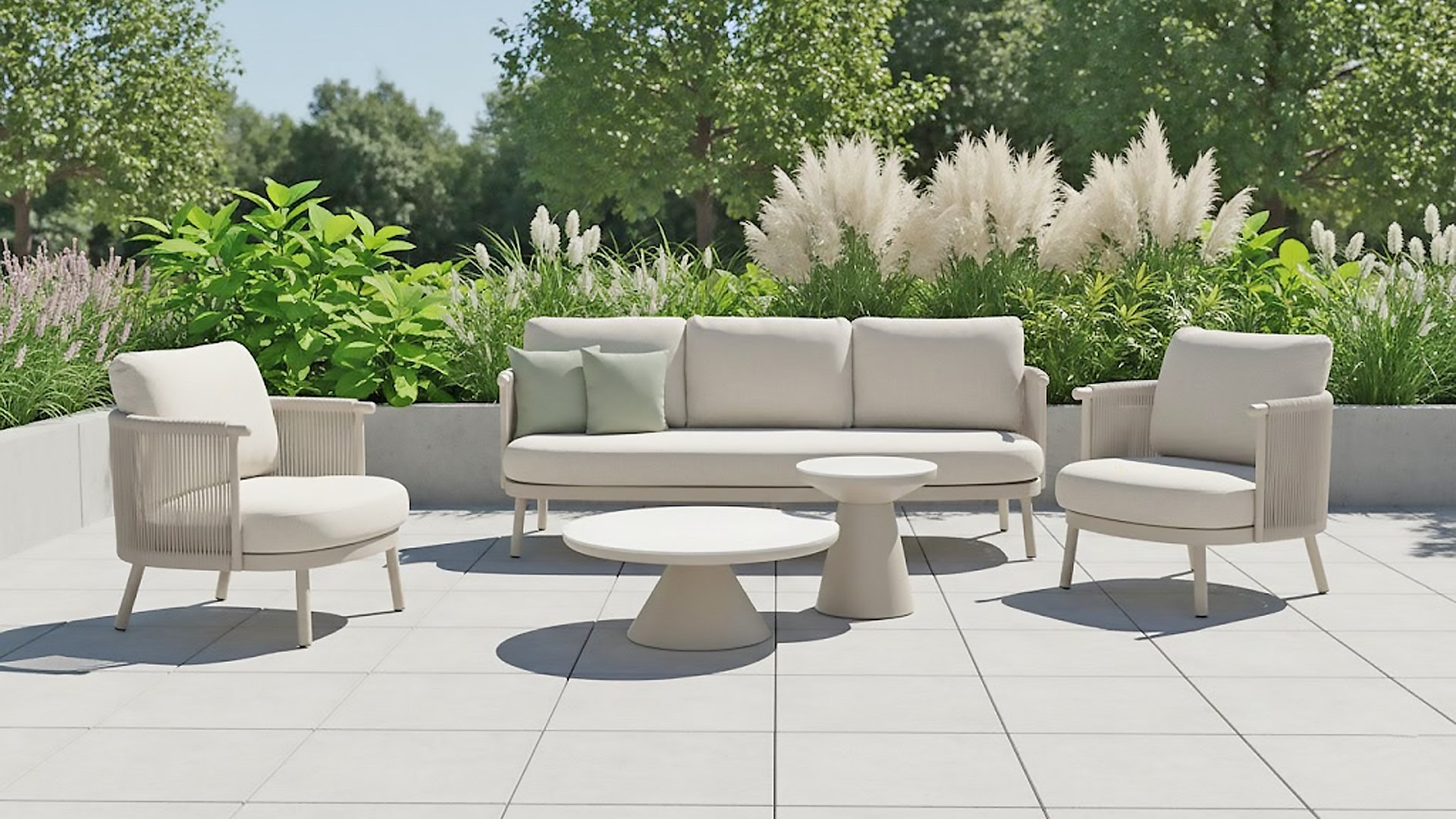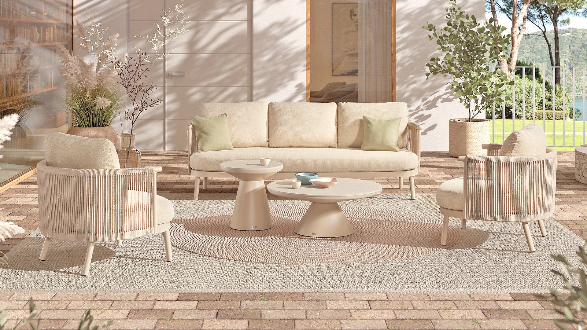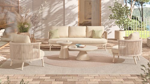 Available in Stylish Colours: The combination of the warm, linen-coloured frame and the elegant, light grey, hand-woven rope creates a modern yet cosy look that fits into any garden. Available with teak or aluminium elements.