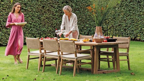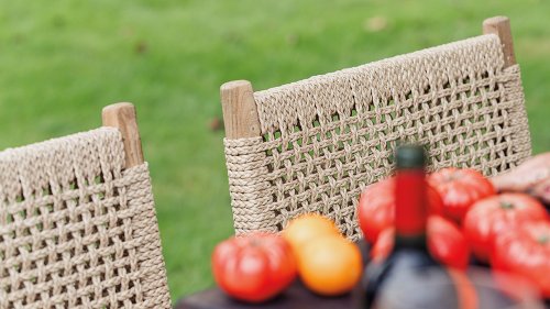 What makes the Menorca garden chair truly unique is the use of recycled teak wood. Each piece of wood carries its own history, creating a lively and authentic appearance. Combined with the hand-woven wicker, this results in a natural harmony that radiates warmth and character.