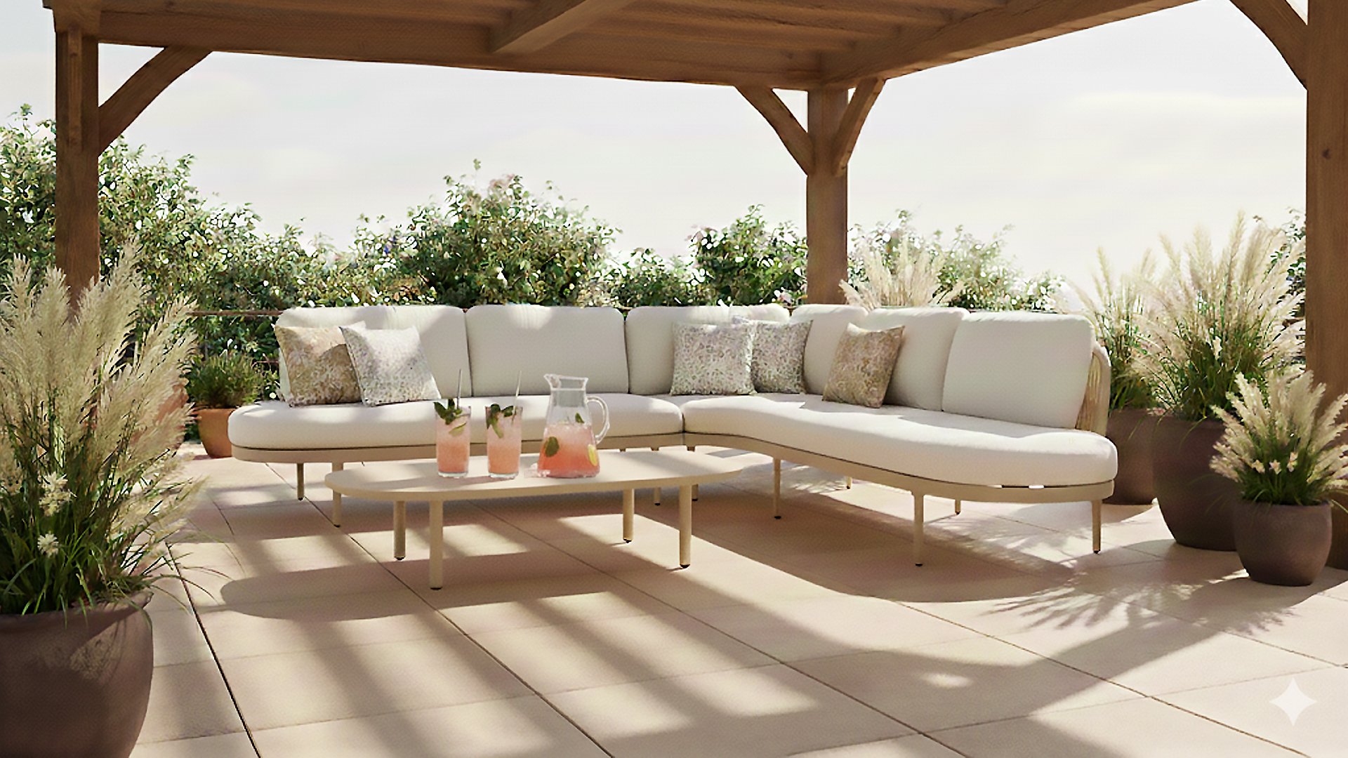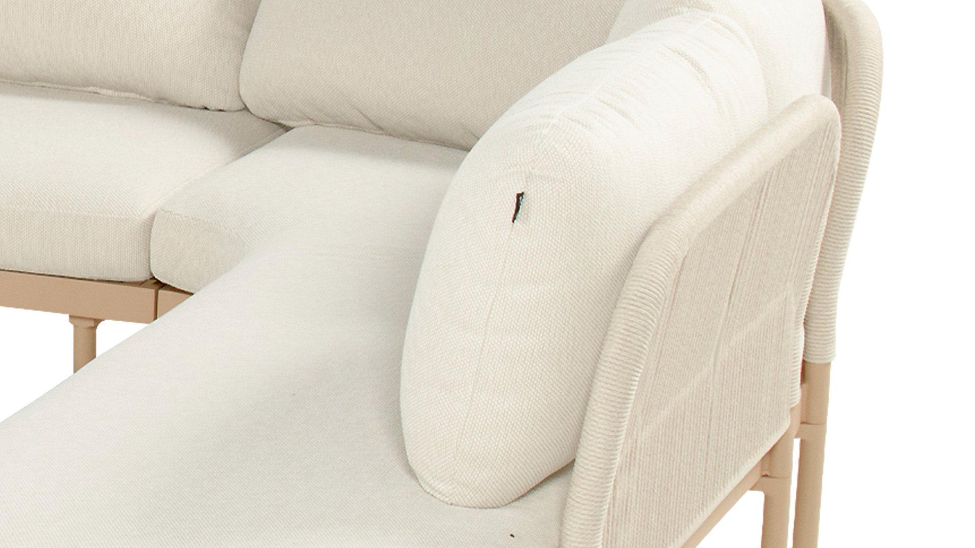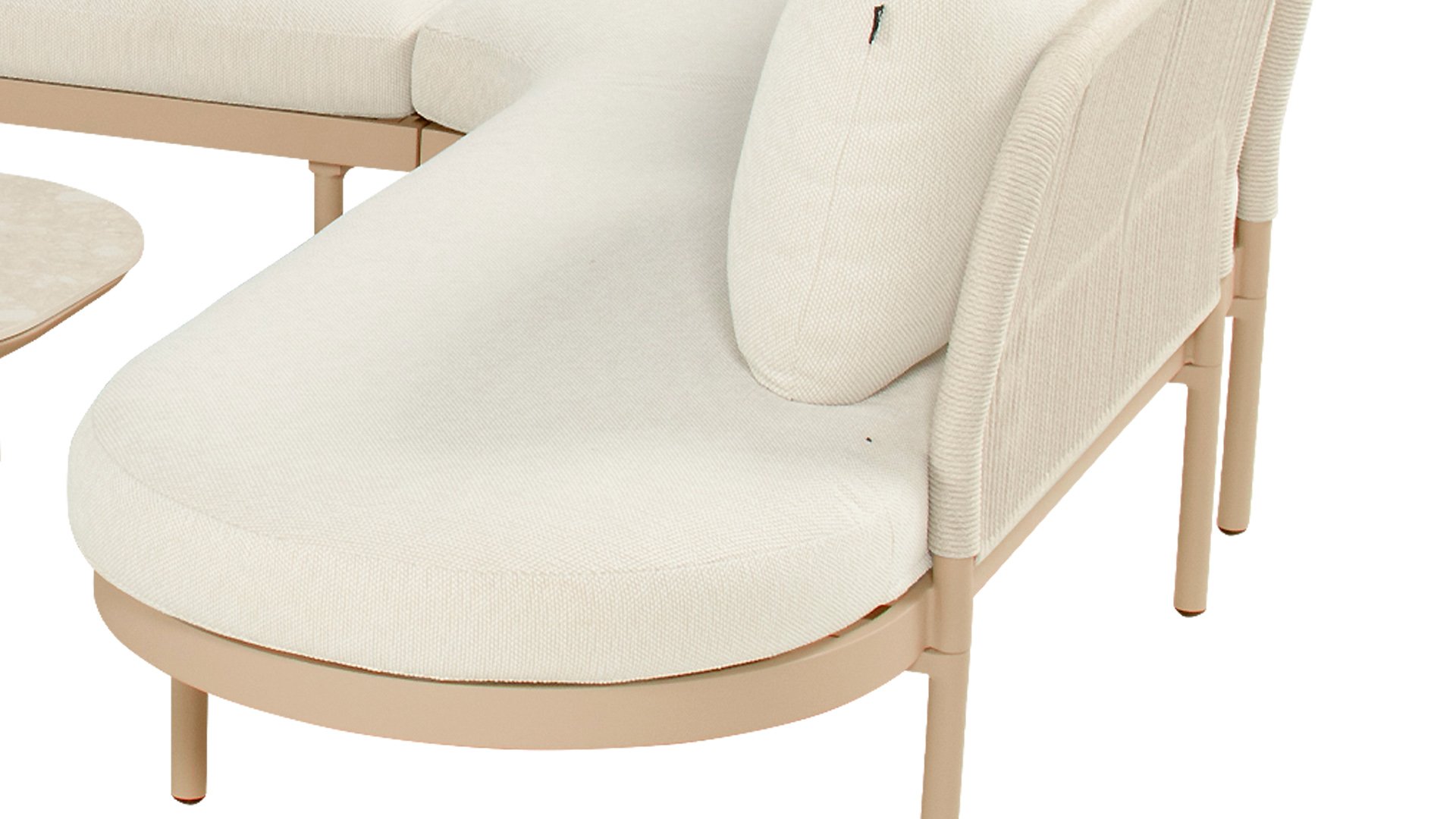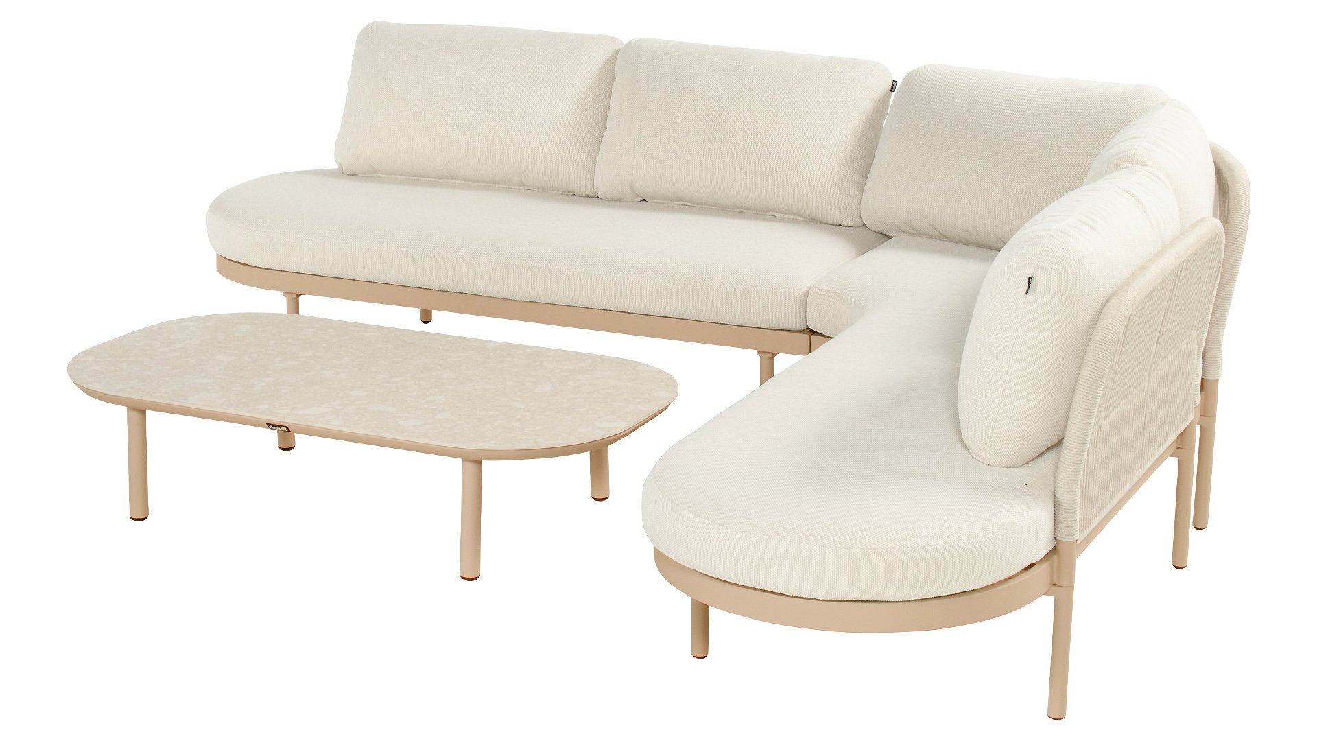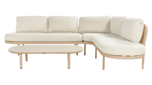 The Biloboa corner lounge set in Sand, Cappuccino or Soft Green invites you to relax in ultimate comfort. The aluminium frame and beige cushions are low-maintenance and weather-resistant. The soft, rounded shapes and elegant rope details, combined with the matching coffee table, create a cosy and warm lounge seating area.