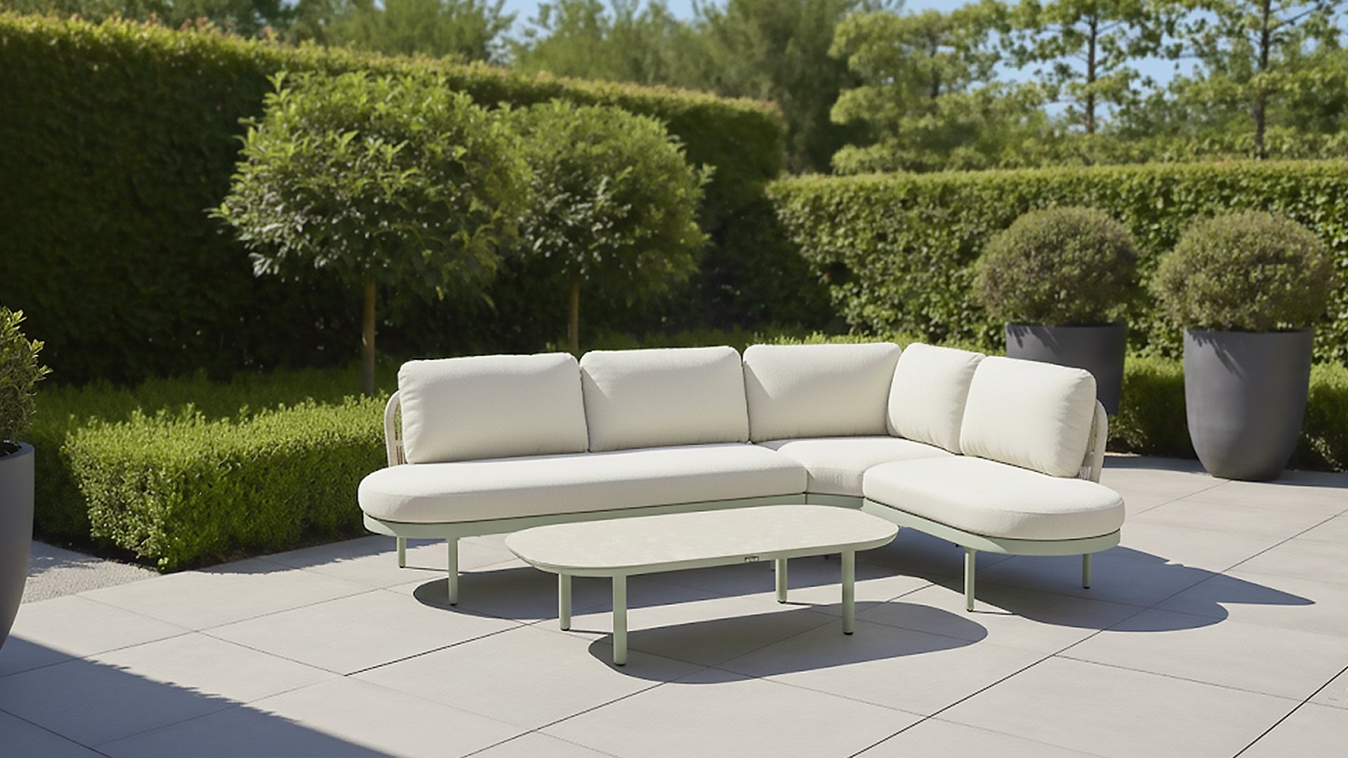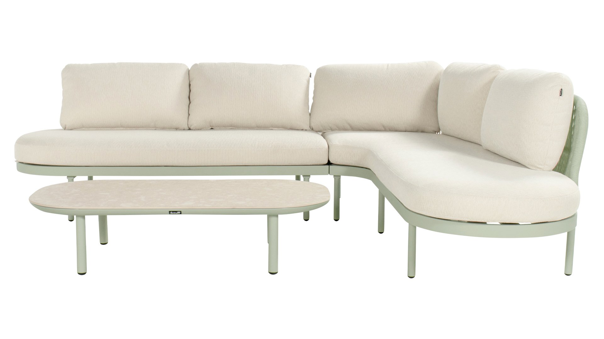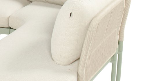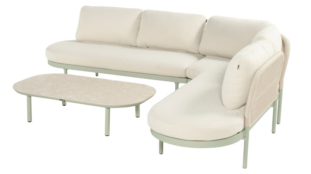 The Biloboa corner lounge set in Sand, Cappuccino or Soft Green invites you to relax in ultimate comfort. The aluminium frame and beige cushions are low-maintenance and weather-resistant. The soft, rounded shapes and elegant rope details, combined with the matching coffee table, create a cosy and warm lounge seating area.