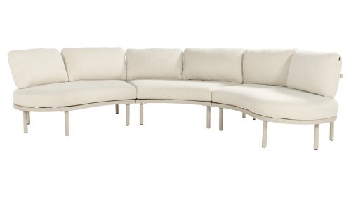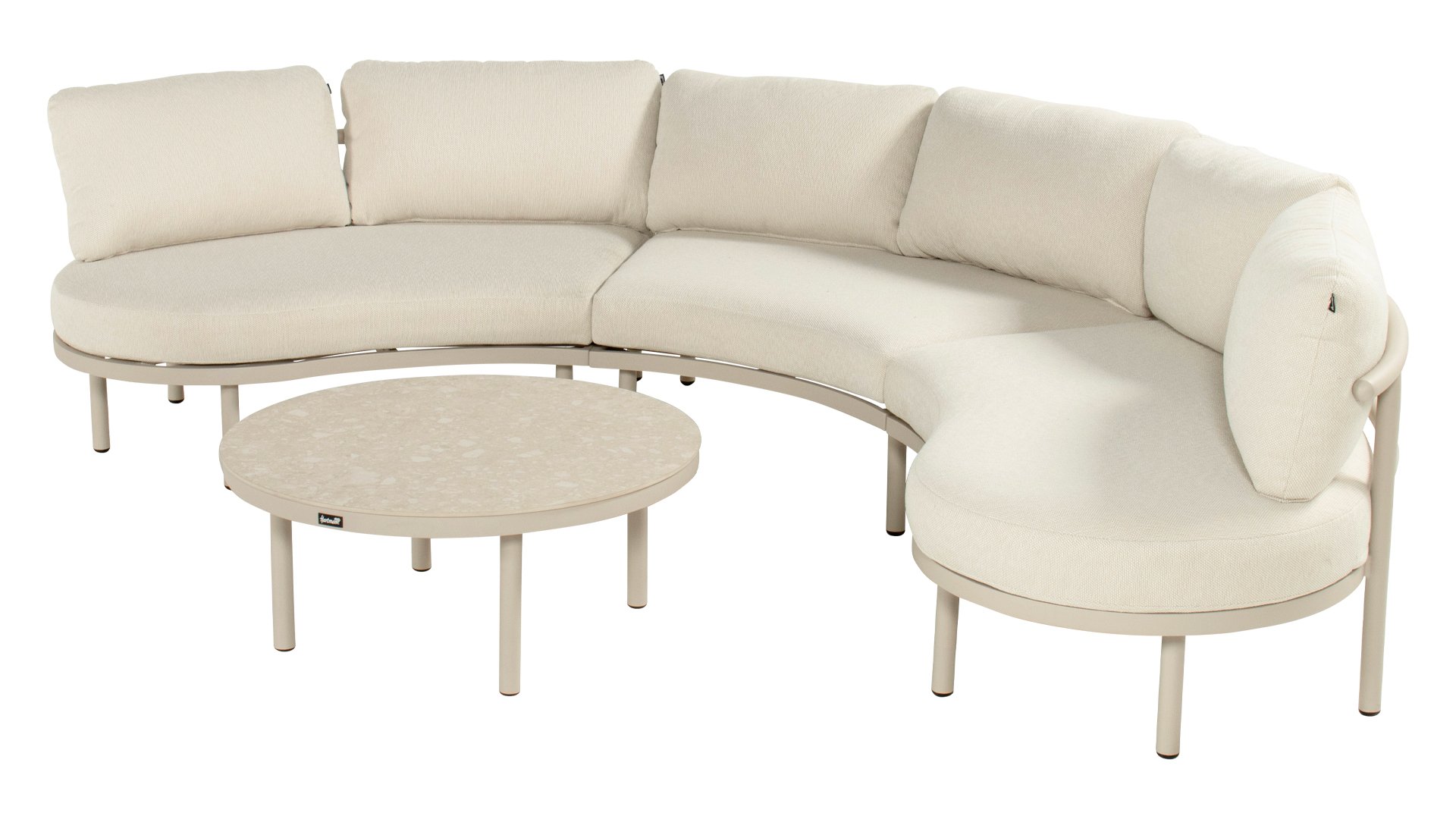 The Palma round lounge set in colors Sand, Cappuccino, or Soft Green invites you to ultimate relaxation. The aluminum frame and beige cushions are low-maintenance and weather-resistant. The round shape and matching coffee table create a cozy, warm seating area.