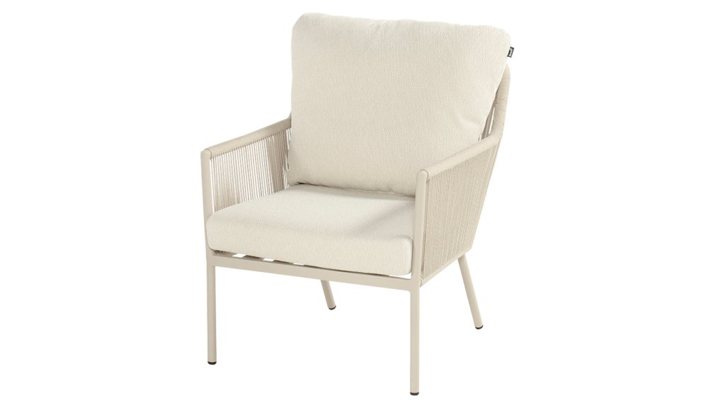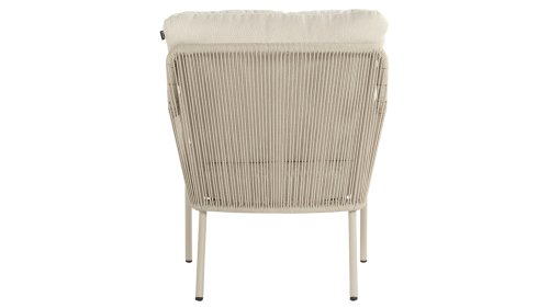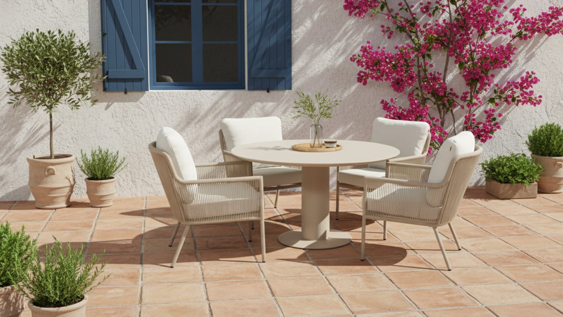 Delightful Lounge and Dining rope chairs with soft beige cushions combined with a round table with a ceramic top. Perfect for long summer evenings with family or friends.