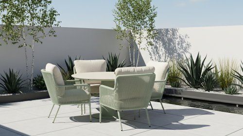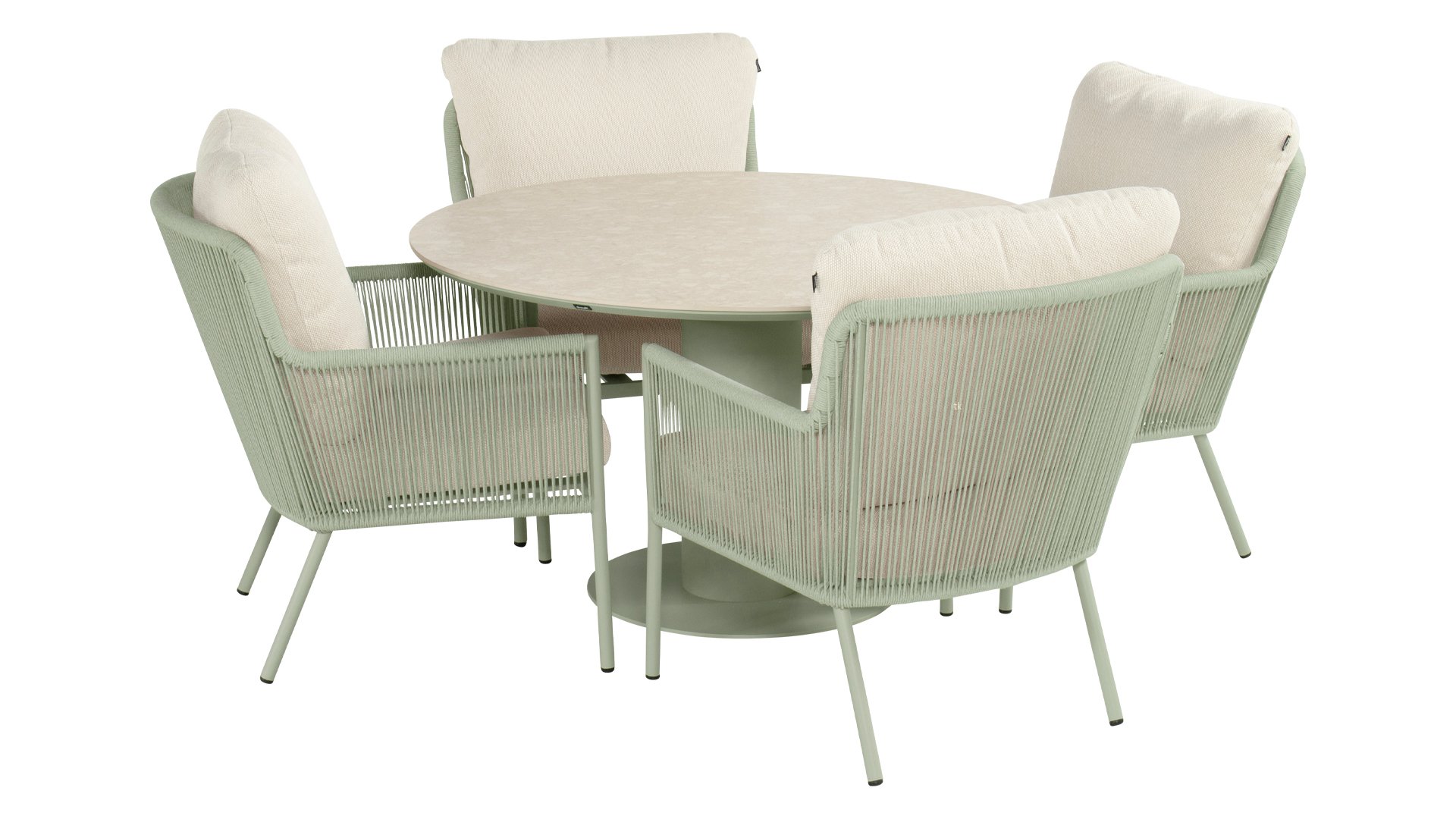 Delightful Lounge and Dining rope chairs with soft beige cushions combined with a round table with a ceramic top. Perfect for long summer evenings with family or friends.