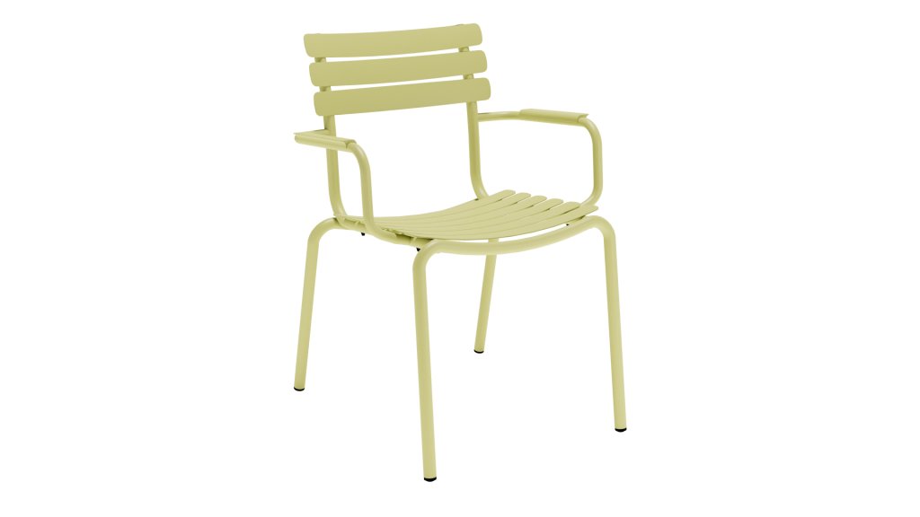 ALUA is available in 6 colors: Muted White / Black / Beige / Cayenne / Ice Blue / Olive Green and offers the choice between models with or without armrests. Designed for easy stacking, up to 10 pieces can be stacked. The curved aluminum slats are shaped to provide a comfortable seating experience and give the chair a soft and inviting appearance.