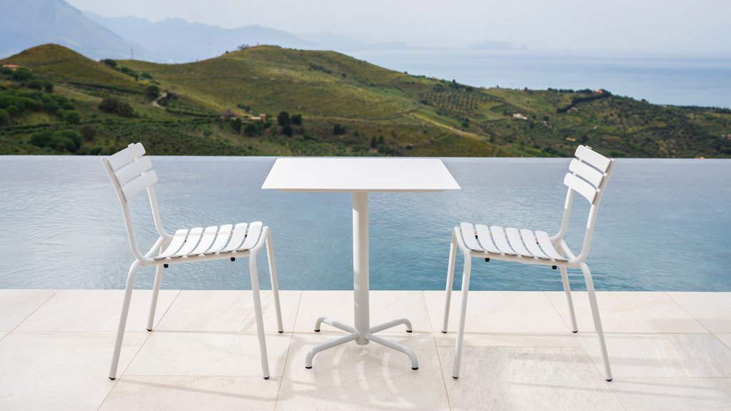 ALUA is a versatile aluminum dining chair, designed for various environments, whether it's a private balcony, a public park, or a restaurant. The chair is built following the design concept of the HOUE ReCLIPS Dining Chair and requires minimal maintenance.