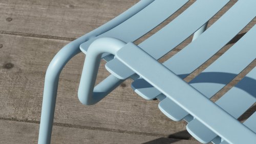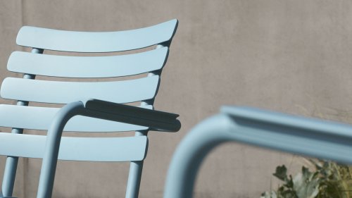 ALUA is available in 6 colors: Muted White / Black / Beige / Cayenne / Ice Blue / Olive Green and is offered not only as a lounge chair but also as a dining chair, with or without armrests. The curved aluminum slats are shaped to provide a comfortable seating experience and give the chair a soft and inviting appearance.
