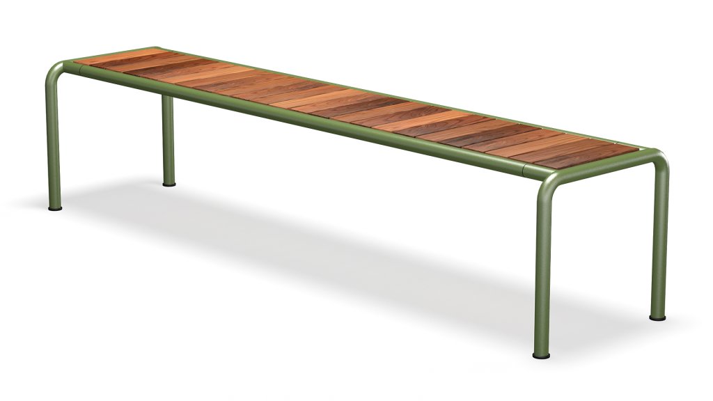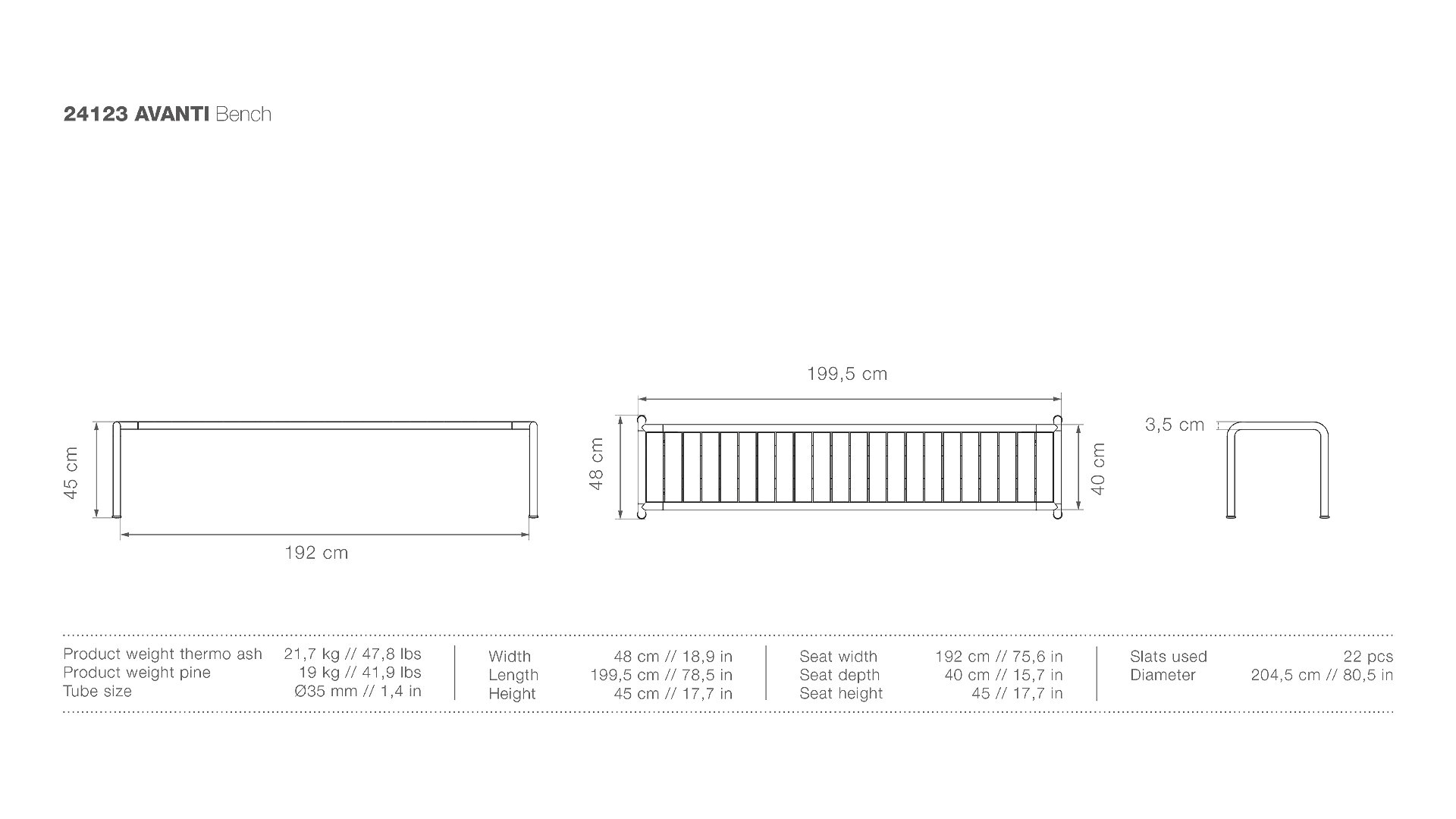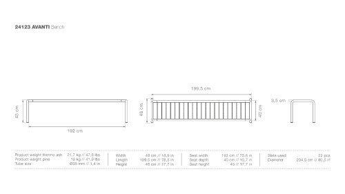 The AVANTI... Whose frames are made of powder-coated steel, which is very low maintenance and extremely durable. There is also a choice of different sizes and another type of seat, including: Avanti Bench Thermo Ash Wood: Medium / Large, Avanti Bench Medium Aluminum: Black / Olive Green / Muted White & the Avanti Bench Large Aluminum: Black / Olive Green / Muted White.