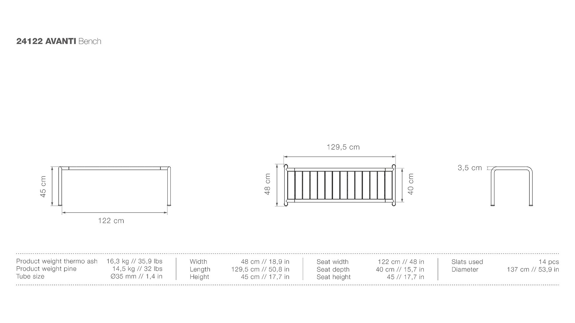 The AVANTI... Whose frames are made of powder-coated steel which is very low maintenance and extremely durable. There is also a choice of different sizes and a different type of seat, including: Avanti Bench Thermo Ash Wood: Medium / Large, Avanti Bench Medium Aluminium: Black / Olive Green / Muted White & the Avanti Bench Large Aluminium: Black / Olive Green / Muted White.