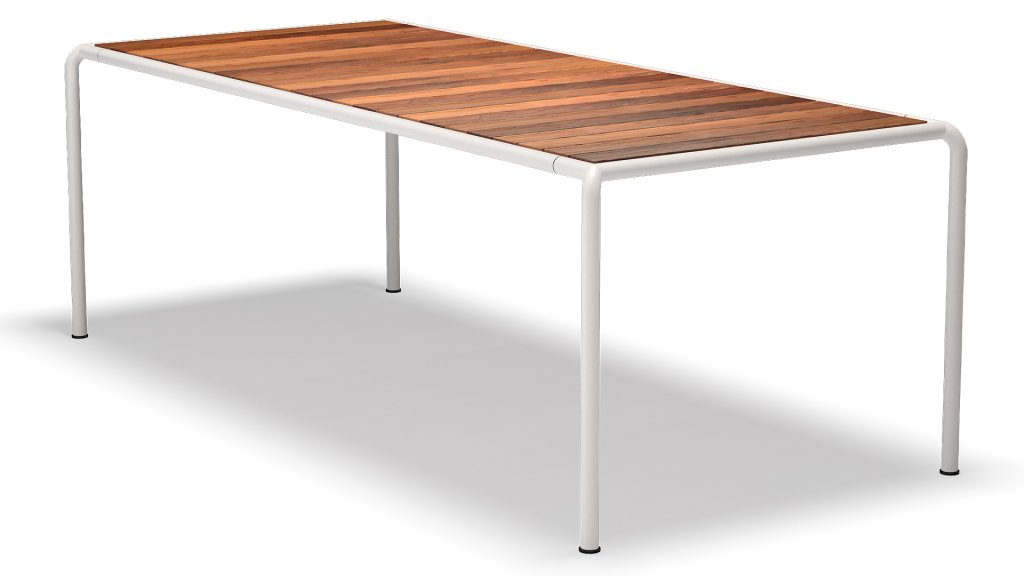 The AVANTI... Unlike the FOUR series from HOUE, the AVANTI features more rounded shapes instead of cubic forms. The AVANTI bases are powder-coated steel, which is very easy to maintain and extremely durable. There are also various sizes and another type of top to choose from. The sizes include: 83cm / 153cm / 222cm. The frames are available in the colors: Black / Olive Green / Muted White. The tabletop is available in thermo ash wood and aluminum. You can remove the top to store it in the shed, regardless of the material. Additionally, you can also extend the table with various attachments.