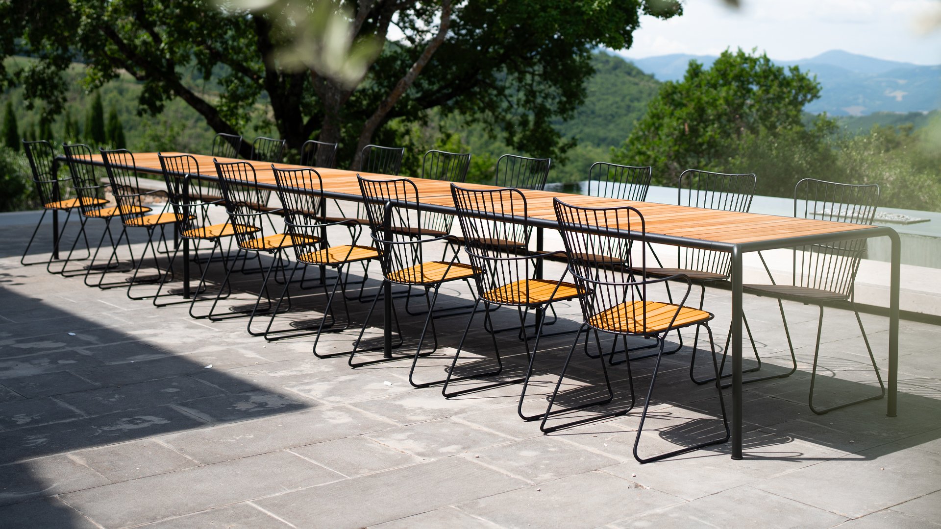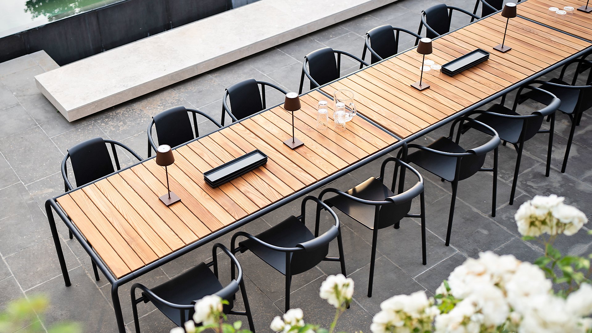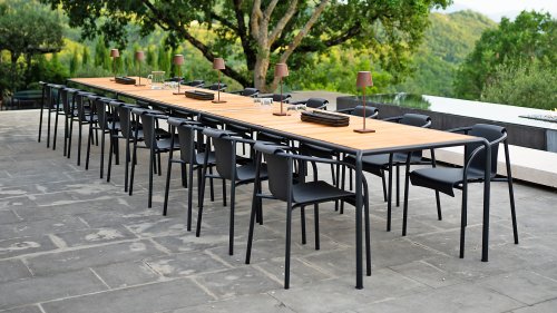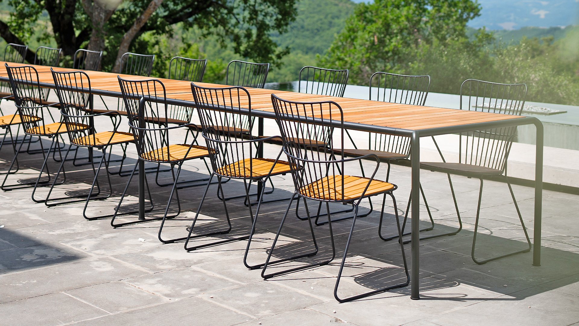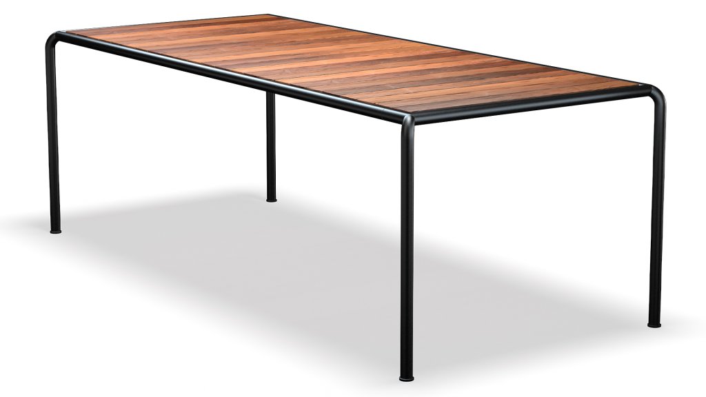 The AVANTI... Unlike the FOUR series from HOUE, the AVANTI has more rounded shapes instead of cubic forms. The AVANTI bases are made of powder-coated steel, which is very low maintenance and extremely sturdy. There is also a choice of different sizes and another type of tabletop. The sizes include: 83cm / 153cm / 222cm. The frames are available in the colors: Black / Olive Green / Muted White. The tabletop of the table is available in thermo ash wood and aluminum. You can remove the tabletop for storage in the shed, regardless of the material. Additionally, you can also extend the table with different components.