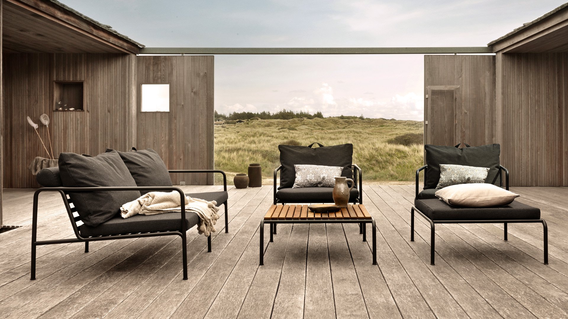 The HOUE AVON collection is designed with the desire to create something with a very light appearance and a low sleek profile, while maintaining a high level of comfort. The maintenance-free frame and construction of the large soft back cushions are exactly that: the simplicity of the structure, where low lines ensure that the design always looks proud, with or without cushions - summer or winter. The handles of the cushions are a statement to the function of the product, making them easy to grab and store when needed.