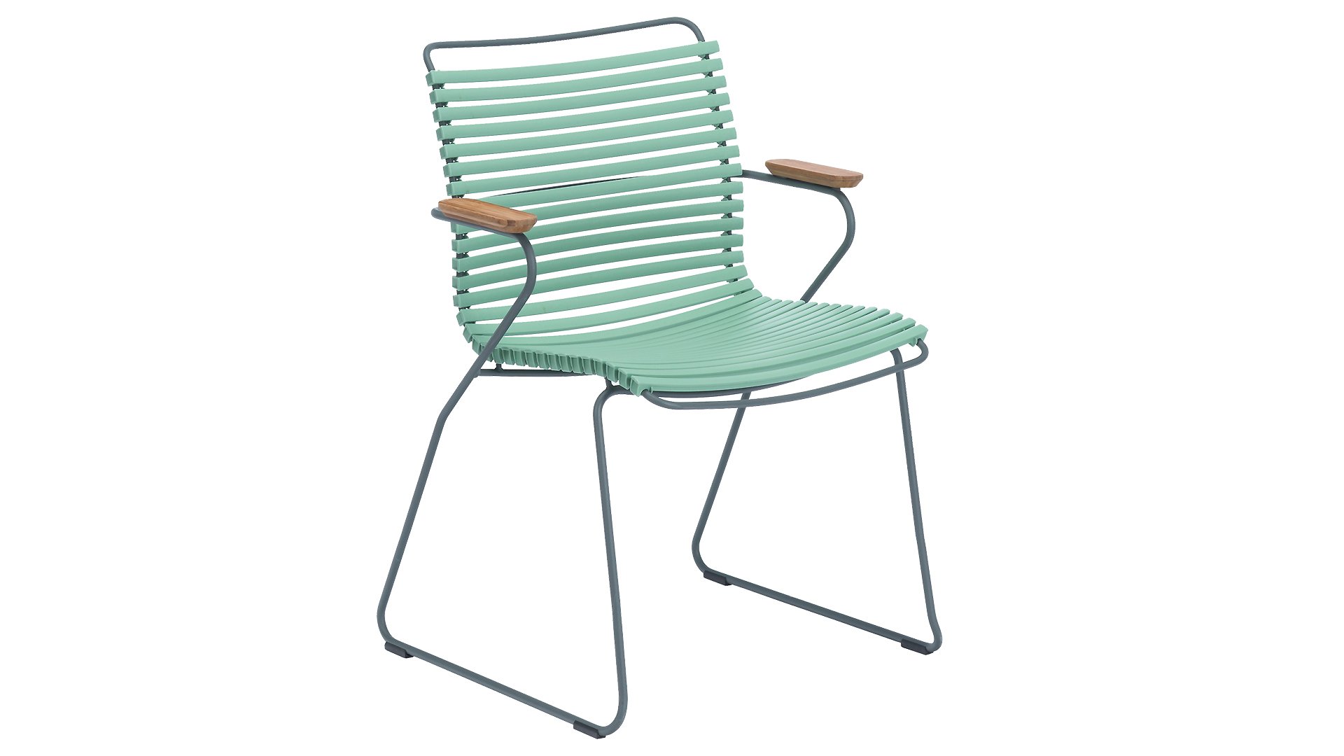 This garden chair is available with or without armrests, and is fully stackable! HOUE CLICK Armchair is simple, honest, and ergonomically designed. This garden chair features a backrest that perfectly adapts to any body, the ergonomically shaped back makes the chair very comfortable to use without a cushion. Also available with a high backrest or as an adjustable chair.