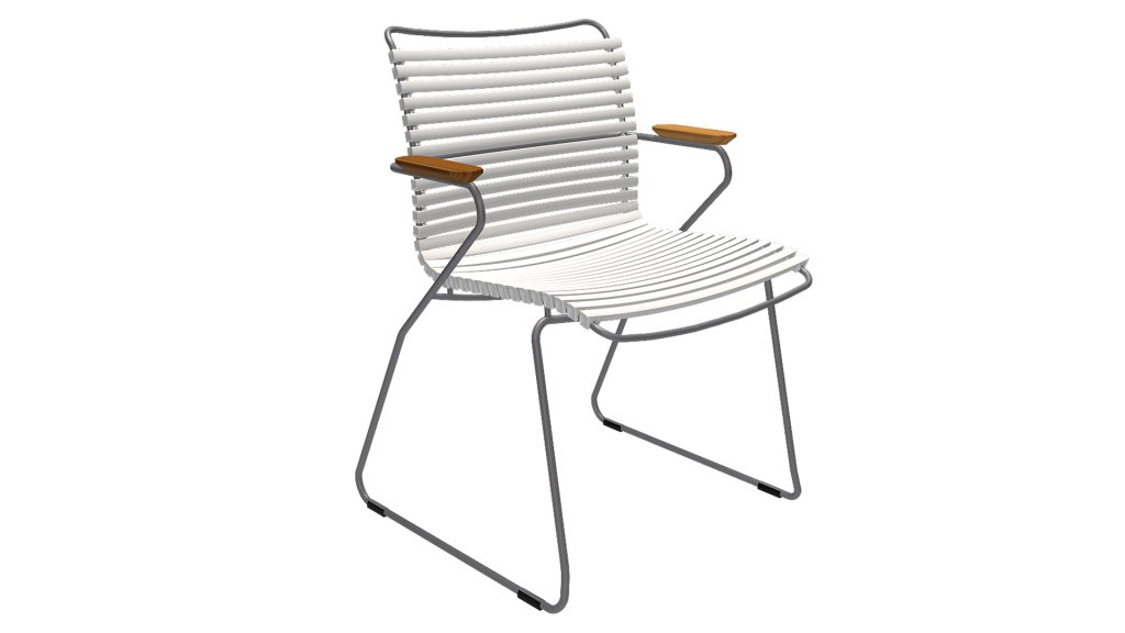 This garden chair is available with or without armrests, and is fully stackable! HOUE CLICK Armchair is simple, honest, and ergonomically designed. This garden chair features a backrest that perfectly adapts to any body, the ergonomically shaped back makes the chair very comfortable to use without a cushion. Also available with a high backrest or as an adjustable chair.