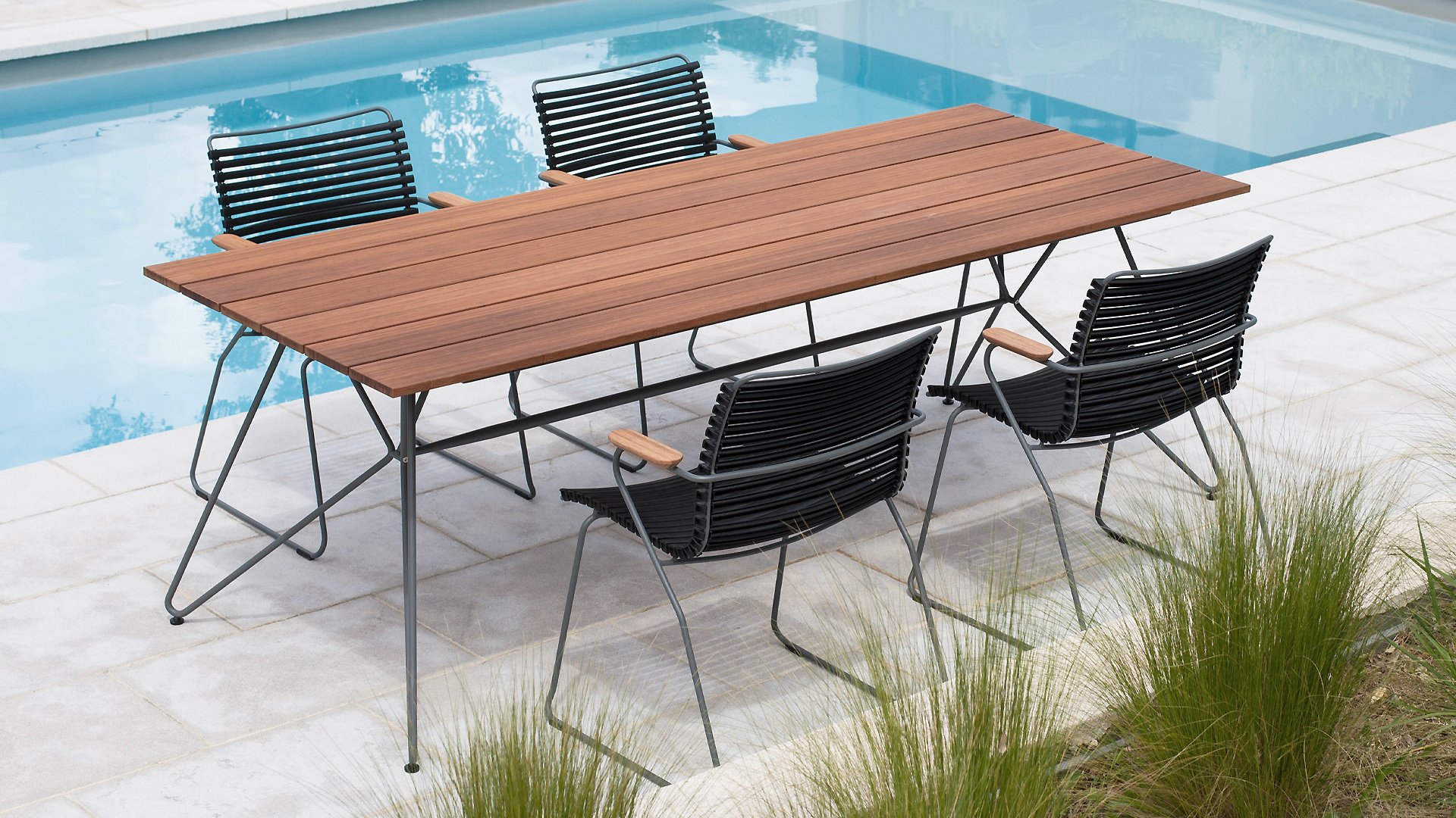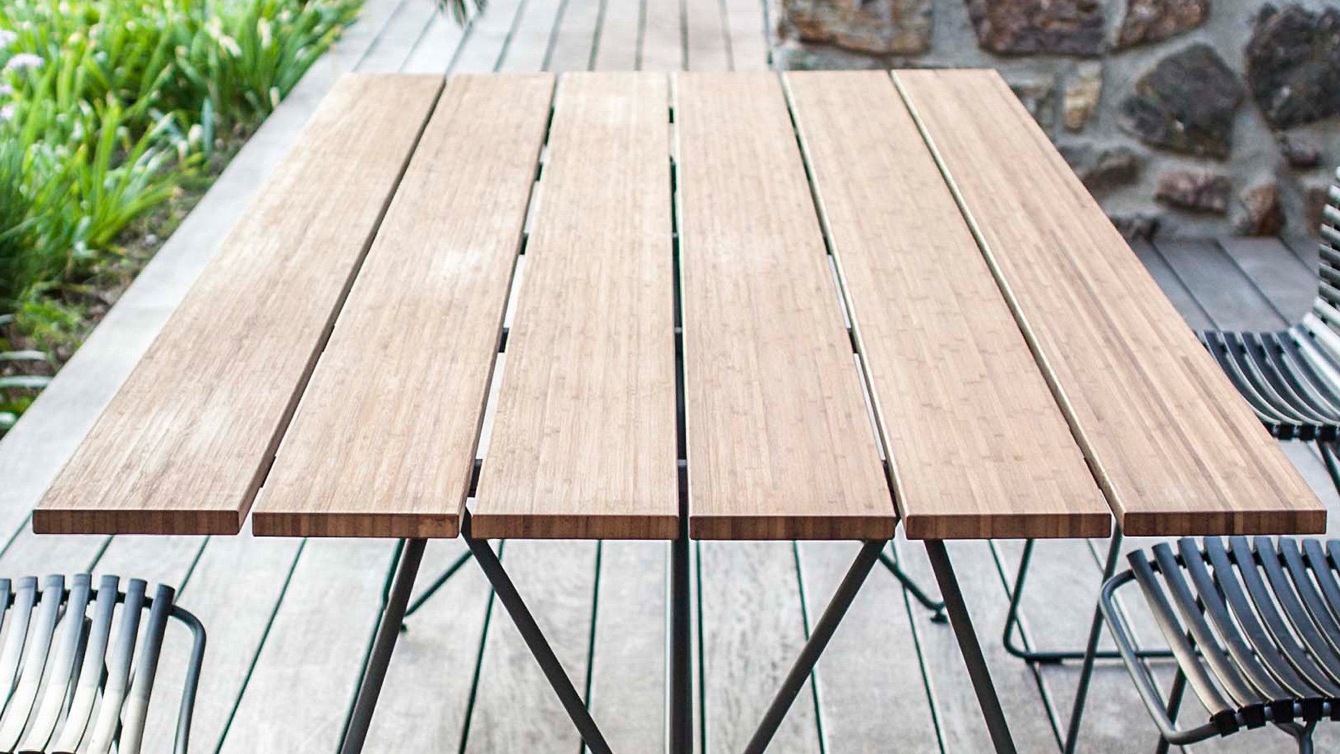 Houe sketch garden table with a bamboo top. This beautiful minimalist garden table from the Danish design brand Houe comes in 2 lengths: 160cm and 210cm. The base is made of steel combined with a special powder coating, which makes the table suitable for outdoor use. This table matches perfectly with the Click dining garden chairs from Houe, as the frame has the same color as the chair frames. Because Bamboo grows much faster, it is a sustainable alternative to teak wood. Bamboo needs to be oiled 2-3 times a year to maintain its beautiful warm color.