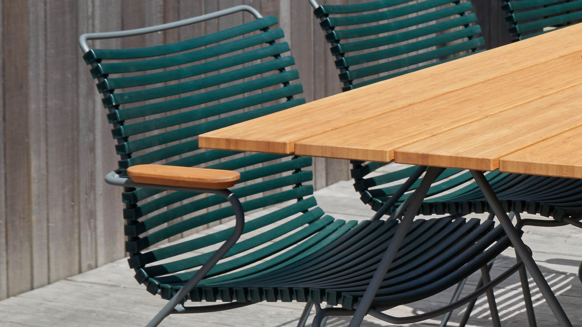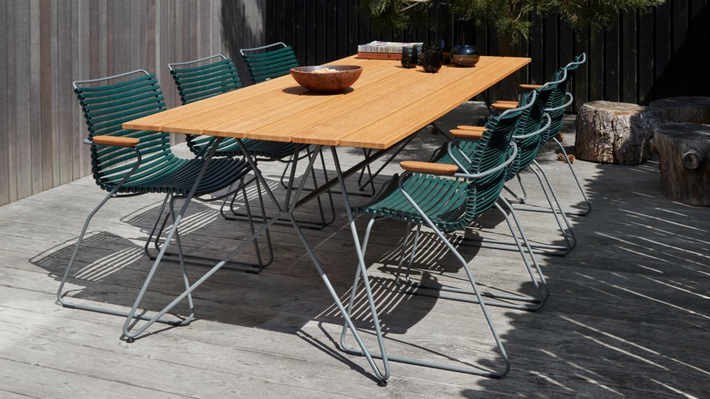 Houe sketch garden table with a bamboo top. This beautiful minimalist garden table from the Danish design brand Houe comes in 2 lengths: 160cm and 210cm. The base is made of steel in combination with a special powder coating, which makes the table suitable for outdoor use. This table goes perfectly with the Click dining garden chairs from Houe, the frame is the same color as the frame of the chairs. Because Bamboo grows much faster, it is a sustainable alternative to teak wood. Bamboo needs to be oiled 2-3 times a year to maintain its beautiful warm color.