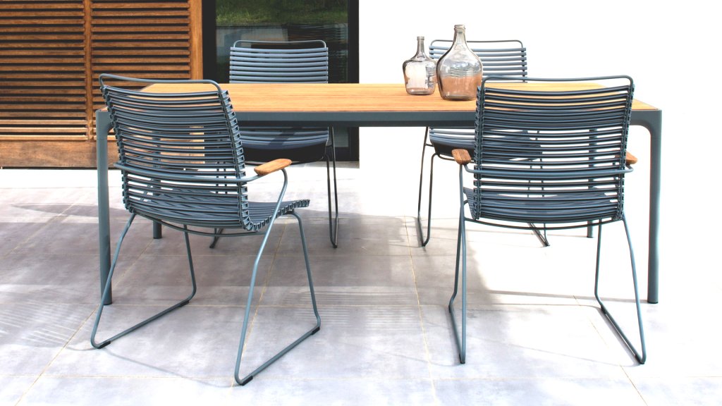 The Four table by Houe is a robust model that fits well in an industrial or rugged interior. The table is designed to withstand weather conditions. The Four table has a strong aluminum frame available in powder-coated gray or black. The bamboo tabletop has a structure that is very suitable for outdoor use. The table comes in sizes with a length of 90, 160, 210 and 270cm , all with a width of 90cm and a height of 74cm (bar table 111cm high). Bamboo is a more sustainable alternative to teak. However, we recommend applying oil to the bamboo 2-3 times a year to maintain its warm colors for a longer time.