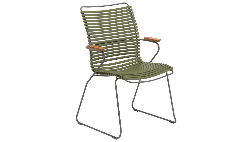 This garden chair is fully stackable! HOUE CLICK Armchair is simple, honest, and ergonomically thought out. This garden chair has a -higher- backrest that perfectly conforms to every body, the ergonomically shaped back makes the chair very comfortable to use without a cushion. Also available with a low back (with or without armrests) or an adjustable one.