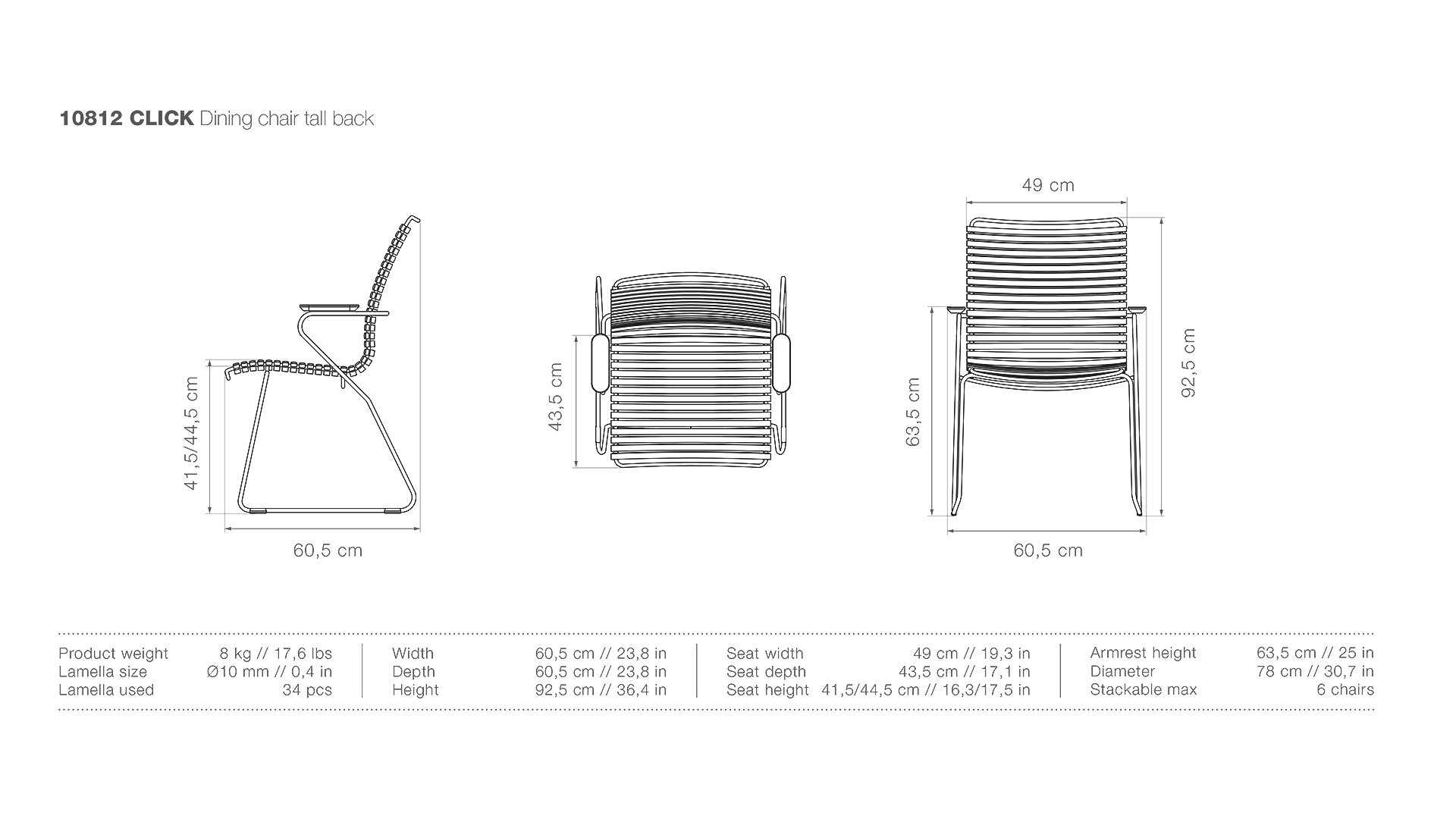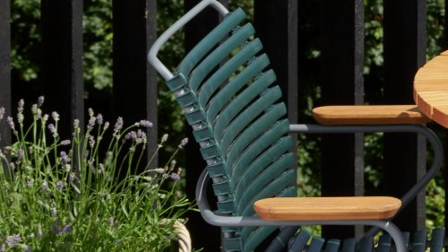 This garden chair is fully stackable! HOUE CLICK Armchair is simple, honest, and ergonomically thought out. This garden chair has a -higher- backrest that perfectly conforms to every body, the ergonomically shaped back makes the chair very comfortable to use without a cushion. Also available with a low back (with or without armrests) or an adjustable one.