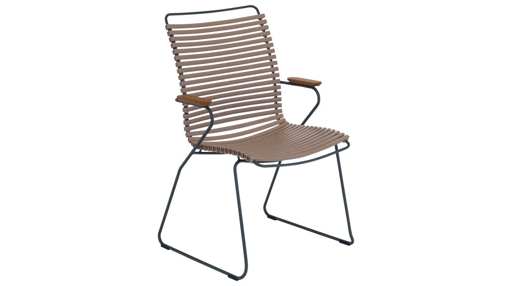 This garden chair is fully stackable! HOUE CLICK Armchair is simple, honest, and ergonomically thought out. This garden chair has a -higher- backrest that perfectly conforms to every body, the ergonomically shaped back makes the chair very comfortable to use without a cushion. Also available with a low back (with or without armrests) or an adjustable one.