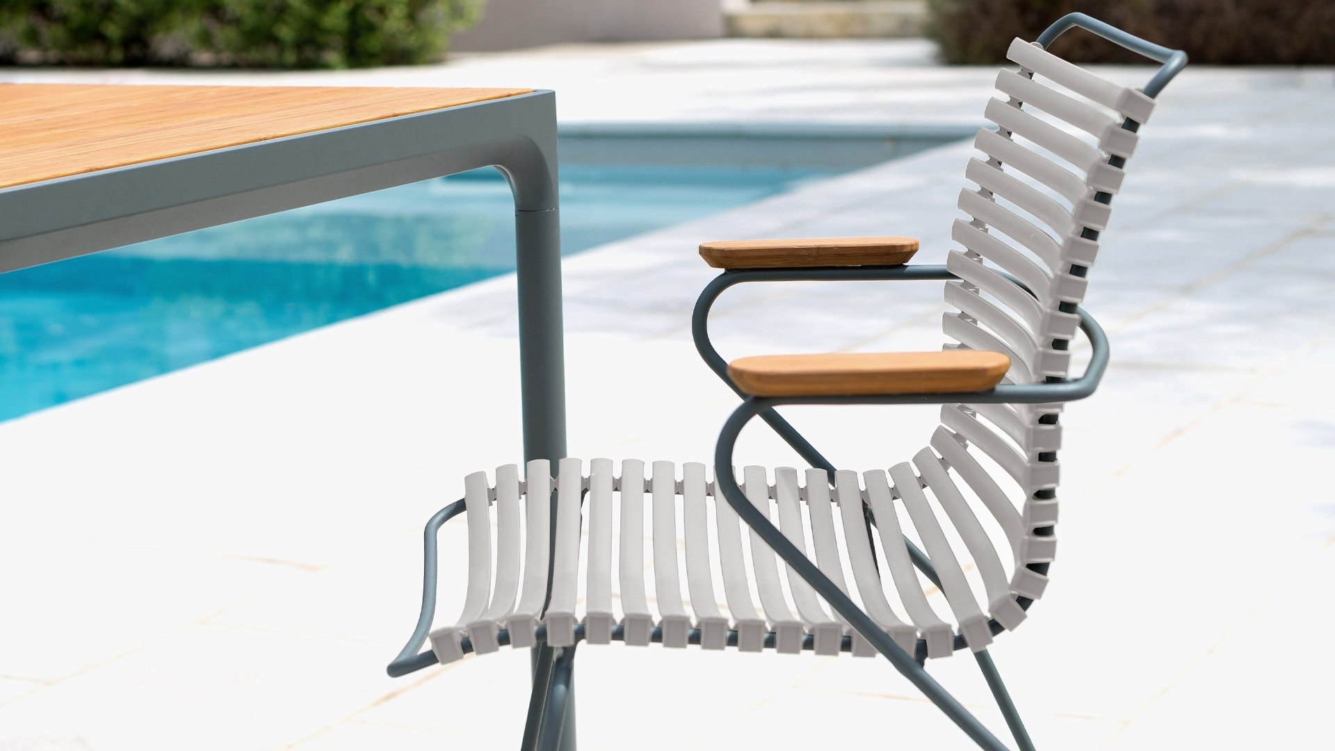 This garden chair is available with or without armrests, and is fully stackable! HOUE CLICK Armchair  is simple, honest, and ergonomically designed. This garden chair features a backrest that perfectly adapts to any body, the ergonomically shaped back makes the chair very comfortable to use without a cushion. Also available with a high backrest or as an adjustable chair.