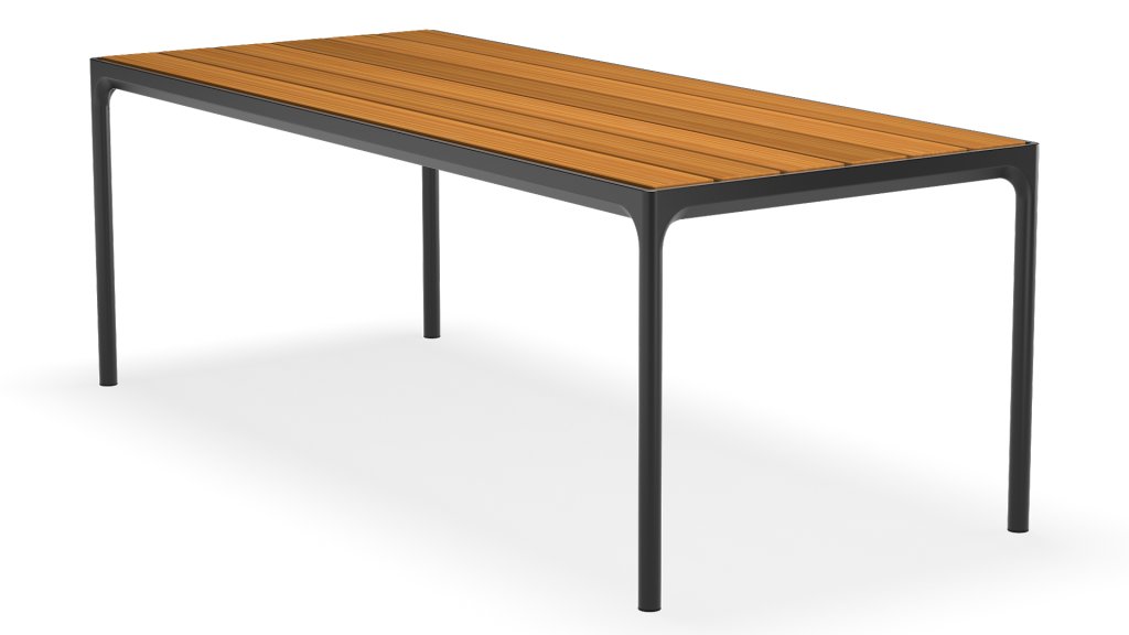 The Four table by Houe is a robust model that fits well within an industrial or rugged interior. The table is designed to withstand the elements. The Four table has a strong aluminum frame available in powder-coated grey or black. The bamboo tabletop has a structure that is very suitable for outdoor use. The table comes in sizes with a length measurement of 90, 160, 210 and 270cm and all have a width measurement of 90cm and a height of 74cm (bar table 90cm and 160cm ). Bamboo is a more sustainable alternative to teak. However, we recommend applying oil to the bamboo 2-3 times a year; this will help the table maintain its warm colors longer.
