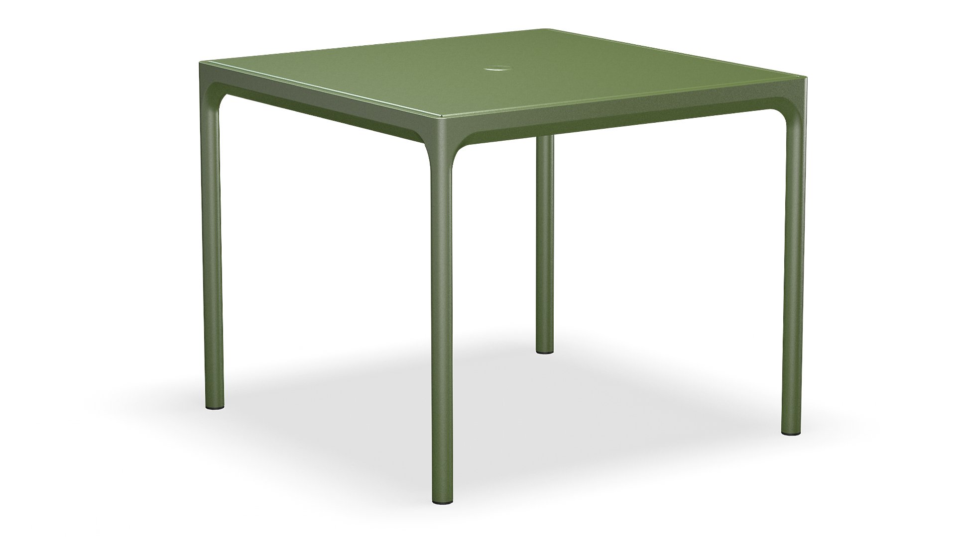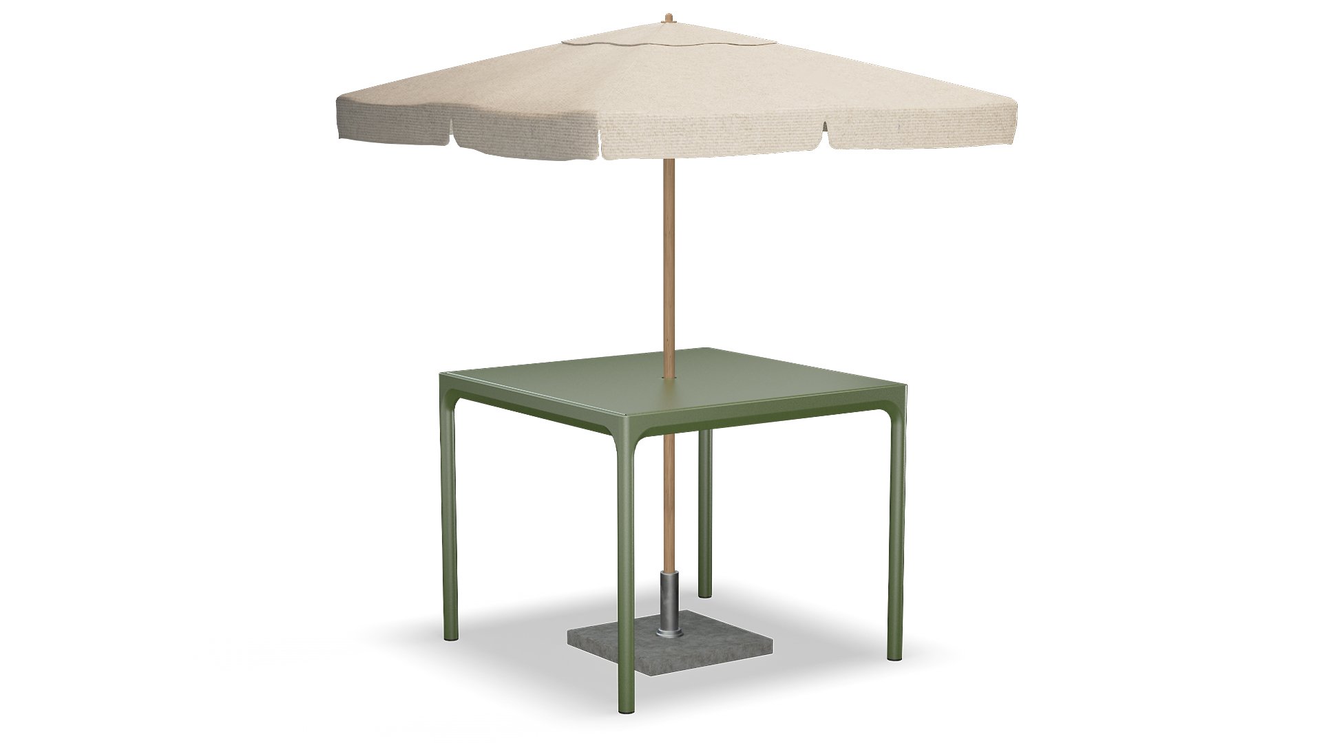 The Houe Four table is a robust model, ideal for industrial or rustic interiors. It is weather-resistant and features a sturdy aluminum frame, available in black, olive green, or muted white. The 90x90cm table has a parasol hole.