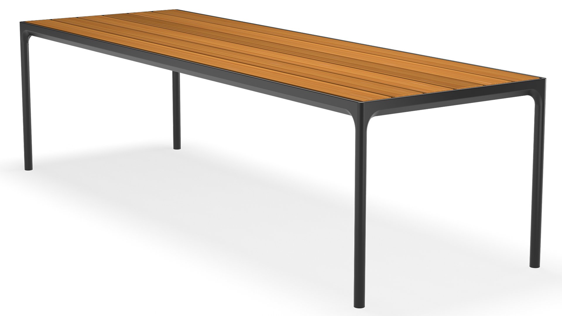 The Four table from Houe is a robust model that fits well within an industrial interior or a sturdy decor. The table is designed to withstand the elements. The Four table has a strong aluminum frame available in powder-coated gray or black. The bamboo tabletop has a texture that is very suitable for outdoor use. The table comes in sizes with a length measure of 90, 160, 210, and 270cm and all have a width measure of 90cm and a height of 74cm (bar table 90cm and 160cm). Bamboo is a more sustainable alternative to teak. We do recommend applying oil to the bamboo 2-3 times a year, as it will help the table retain its warm colors longer.