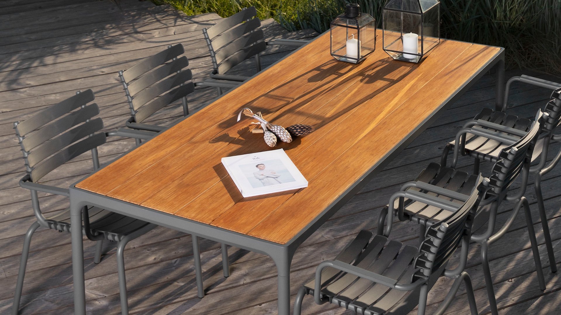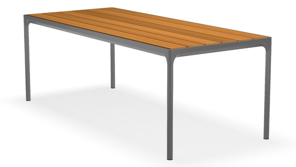 The Four table by Houe is a robust model that fits well within an industrial or sturdy interior. The table is designed to withstand the elements. The Four table features a strong aluminum frame available in powder-coated gray or black. The bamboo tabletop has a texture that is very suitable for outdoor use. The table comes in sizes with a length of 90, 160, 210, and 270cm and all have a width of 90cm and a height of 74cm (bar table 111cm high). Bamboo is a more sustainable alternative to teak. We do recommend to oil the bamboo 2-3 times a year; this way, the table will retain its warm colors longer.