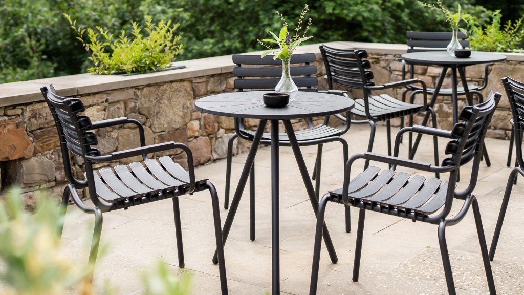 HOUE ReClips Dining collection: Lightweight with a minimalist design. Made from fully recycled plastic! The garden chair is designed by Henrik Pedersen, a Danish designer known for the iconic Click! Available in 4 colors, with bamboo or aluminum armrest.