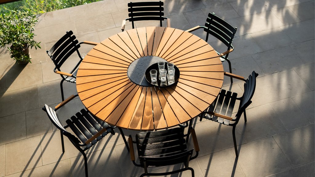 The Houe circle is a round garden table with a beautiful mottled bamboo top. The circle comes in 2 sizes, namely 150cm and 110cm. The great thing about this round table is that it offers plenty of space. In the middle of the circle table, there is a composite stone. This is useful when you need to place your hot pans, etc. The Scandinavian design combined with the sustainable bamboo make this table stand out in any garden. Bamboo is a fast-growing plant and therefore much more sustainable than teak. We advise oiling the table 2-3 times a year. When the table is well maintained, it will last a long time and retain its beautiful colors.