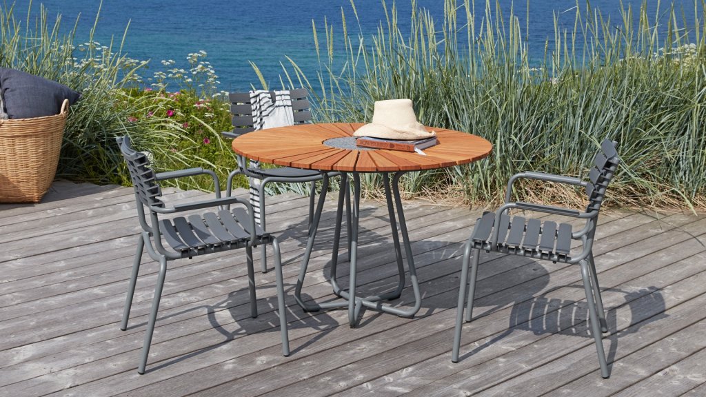 HOUE ReClips Dining collection: Lightweight with a minimalist design. Made from entirely recycled plastic! The garden chair is designed by Henrik Pedersen, a Danish designer we already know from the iconic Click! Available in 4 colors, with bamboo or aluminum armrest.